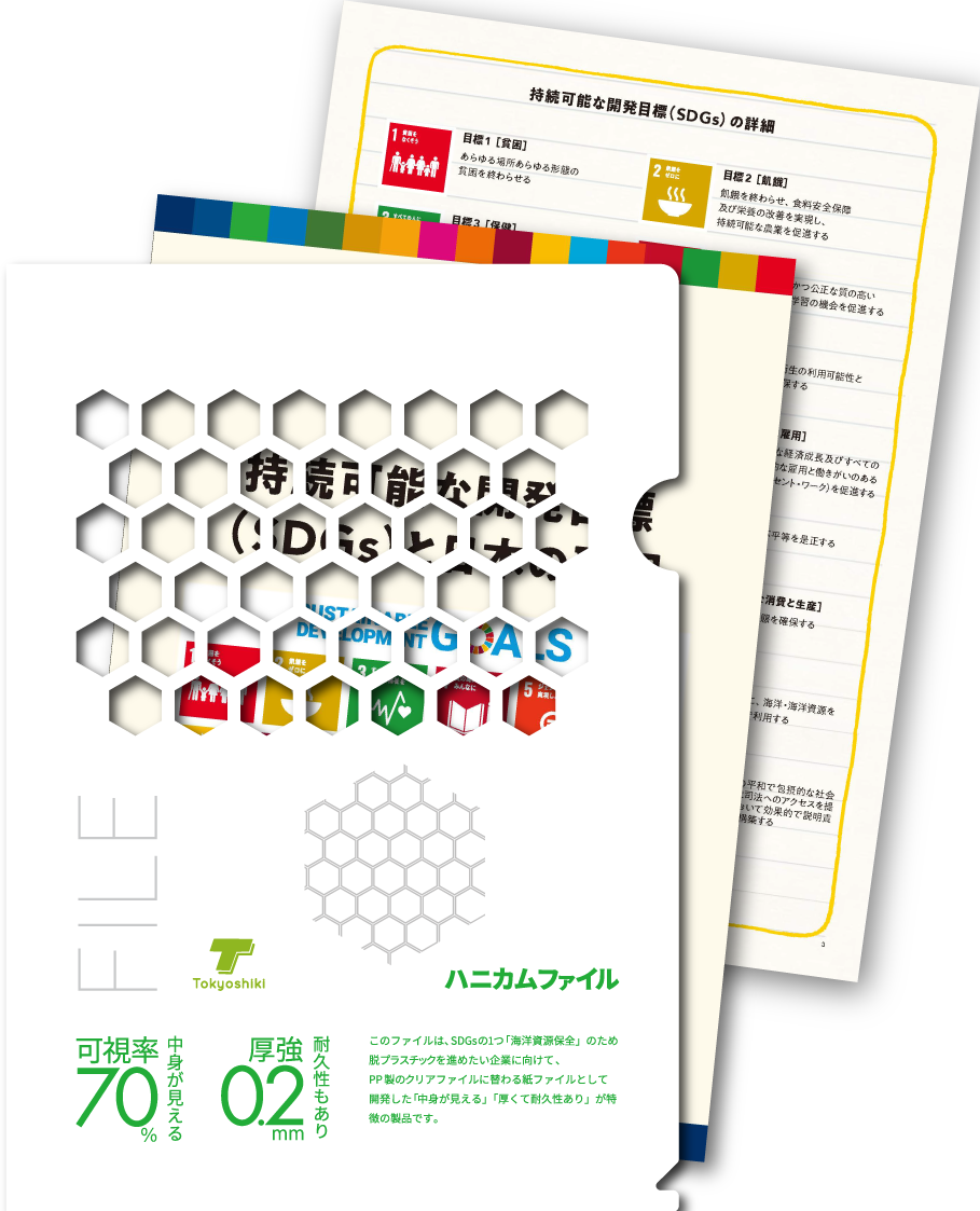 全体がいびつにならない安定した構造、面積あたりの孔数を最も効率よく増やせるという特徴を活かし、型や打ち抜きの知識、技術も最大限活用した結果、孔が配置されている表面積全体に対し70%の孔面積があるので中を確認することが可能且つ厚みのある紙を使えるため強度も兼ね備えた当社オリジナルの「ハニカムファイル」が完成しました。