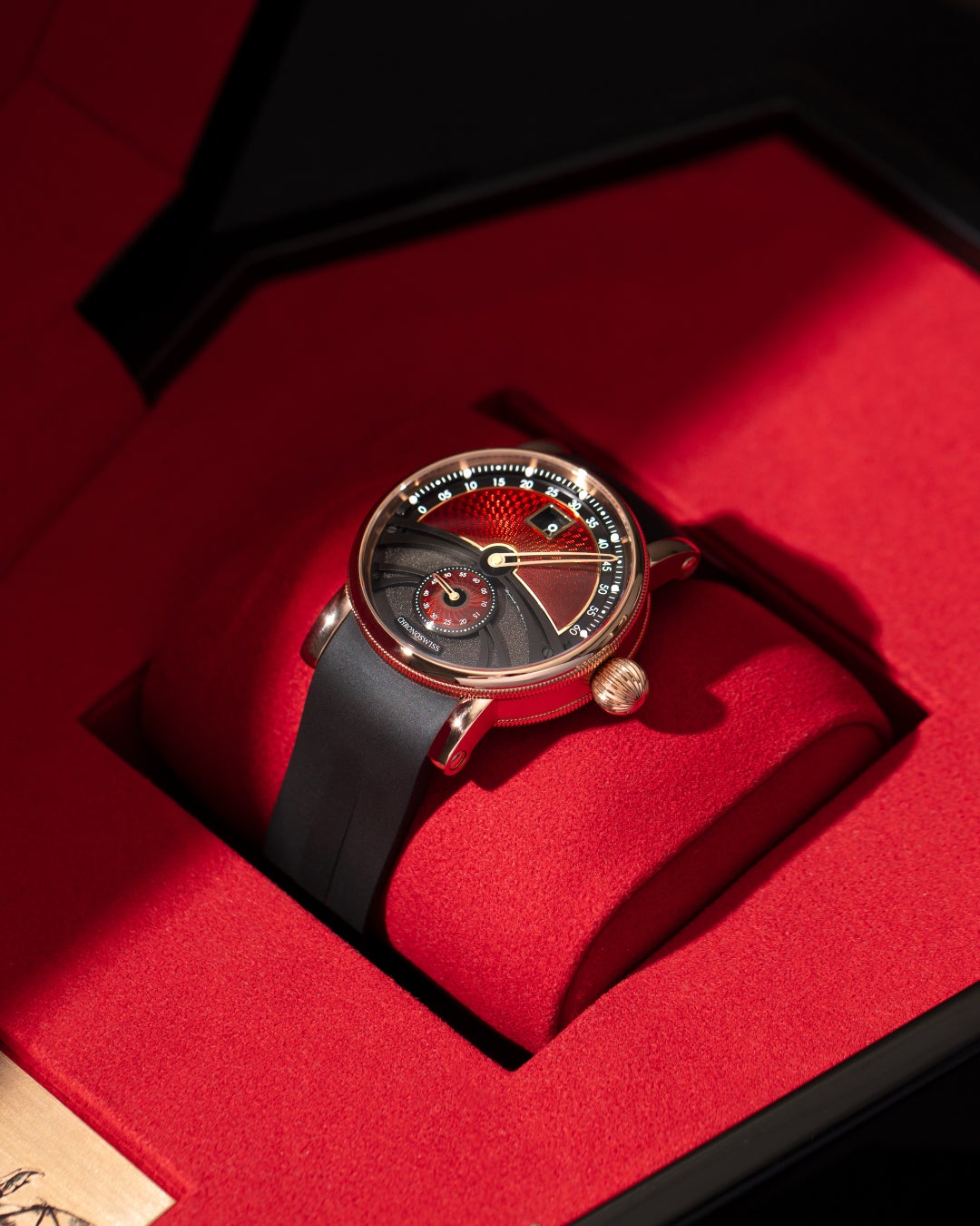 90年代のアイコニックな「デルフィス」からインスピレーションを得て、伝統と現代性を融合させた2024年の新作です。心臓部にはラ・ジュー・ペレと共同開発をした、新しい自社開発ムーブメント C.6004 が搭載され、「デルフィス」の特徴である複雑機構ジャンピングアワーとレトログラードミニッツを継承しています。もう一つの特徴である、曲面の文字盤とスモールセコンドにはハンドギョーシェを施し、そも上にエナメルを7層にも塗り重ねています。
