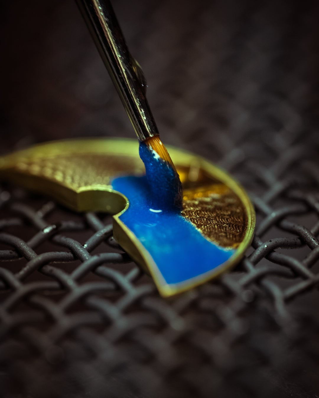 焼成という工程では、理想の色を出すまで半透明のエナメルを 7 層にも重ねるという高い技術が必要です。グラン・フー エナメルは、高温の熱で焼き上げるため一般的な技法より遥かに美しい色の文字盤が完成します。