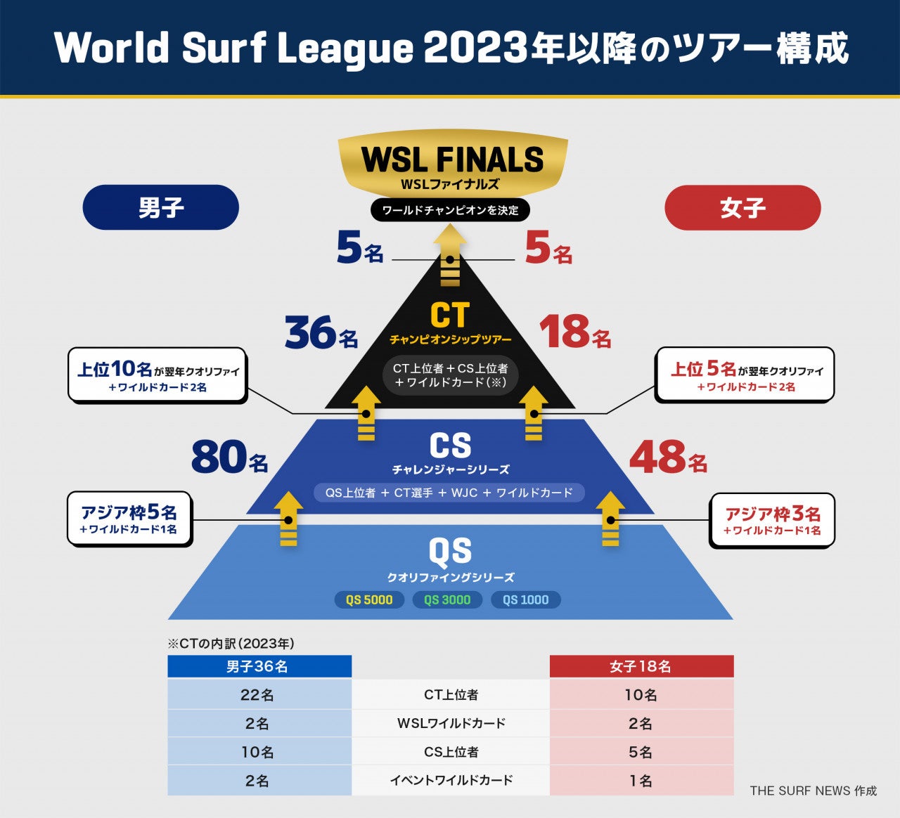 競技人口は現在世界で約1億2000万人にのぼると言われ、直近10年間でサーフィン人口が50%以上拡大している人気のスポーツです。サーフィンには、ワールド・サーフ・リーグ(以下、WSL)が運営する、世界ランキングを決めるワールドツアーがあり、世界チャンピオンを決める「チャンピオンシップ・ツアー(以下、CT)」と各大陸で勝ち上がってきた選手たちがCT入りを目指す「チャレンジャーシリーズ(以下、CS)」、地域予選となる「クオリファイ・シリーズ(以下、QS)」の3カテゴリーで構成されています。男子・女子サーフィンの「QS」シリーズは、獲得ポイント・賞金を基準に1000、3000、5000グレードに分かれ、上位カテゴリーであるCS参戦の権利となるポイント4月10日までに競い合う。