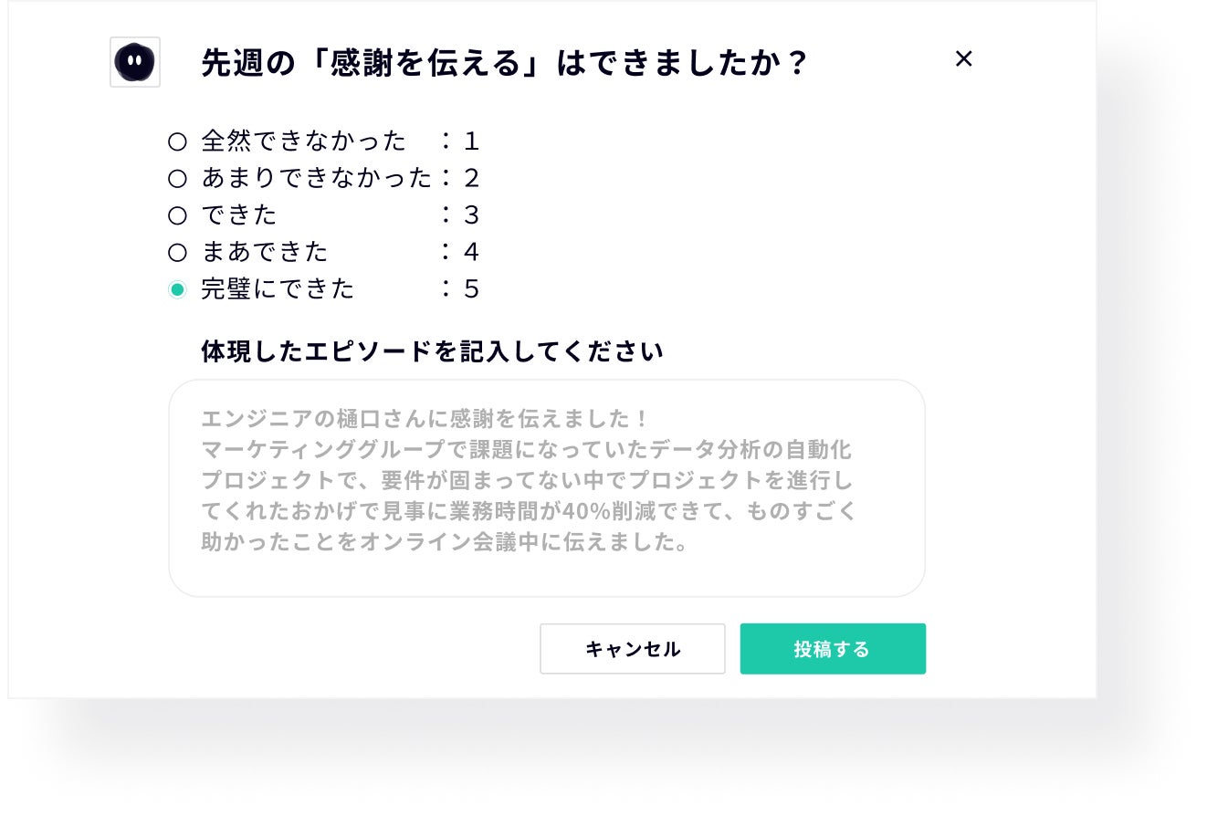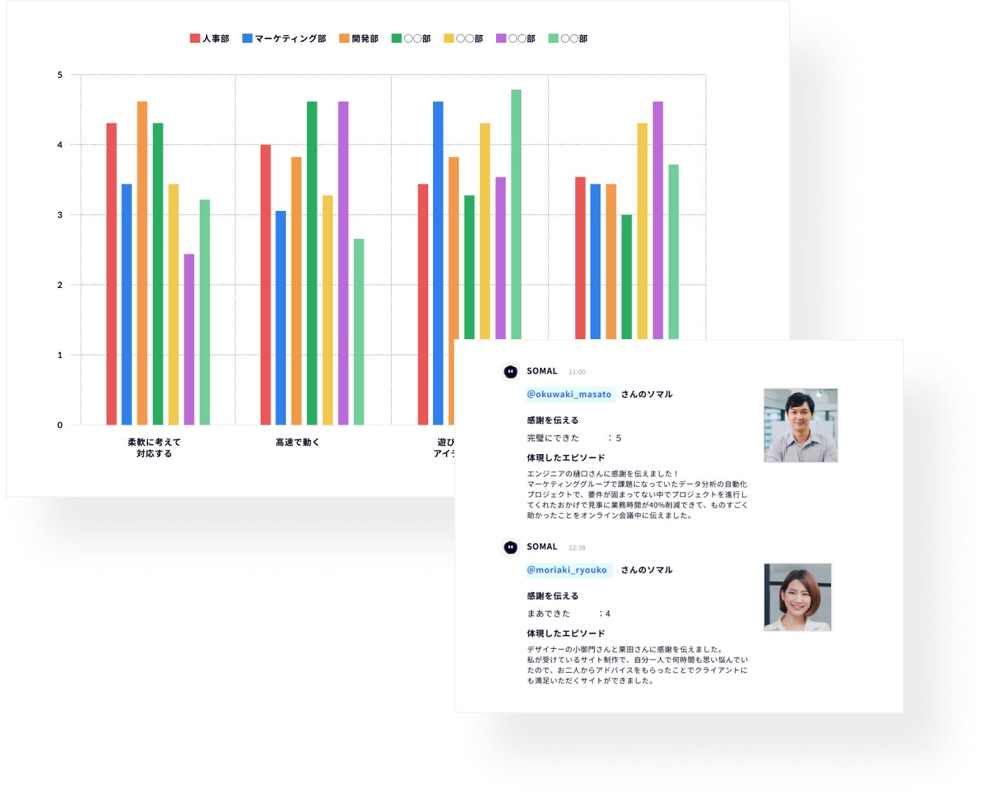 質問の回答内容は定量的に数値化し、どの社員にどれだけ理念が浸透しているかを把握することができます。理念を体現した定性的なエピソードを社員同士で共有することもでき、周りの社員がどのように理念に沿った行動をしているのかを知ることもできます。