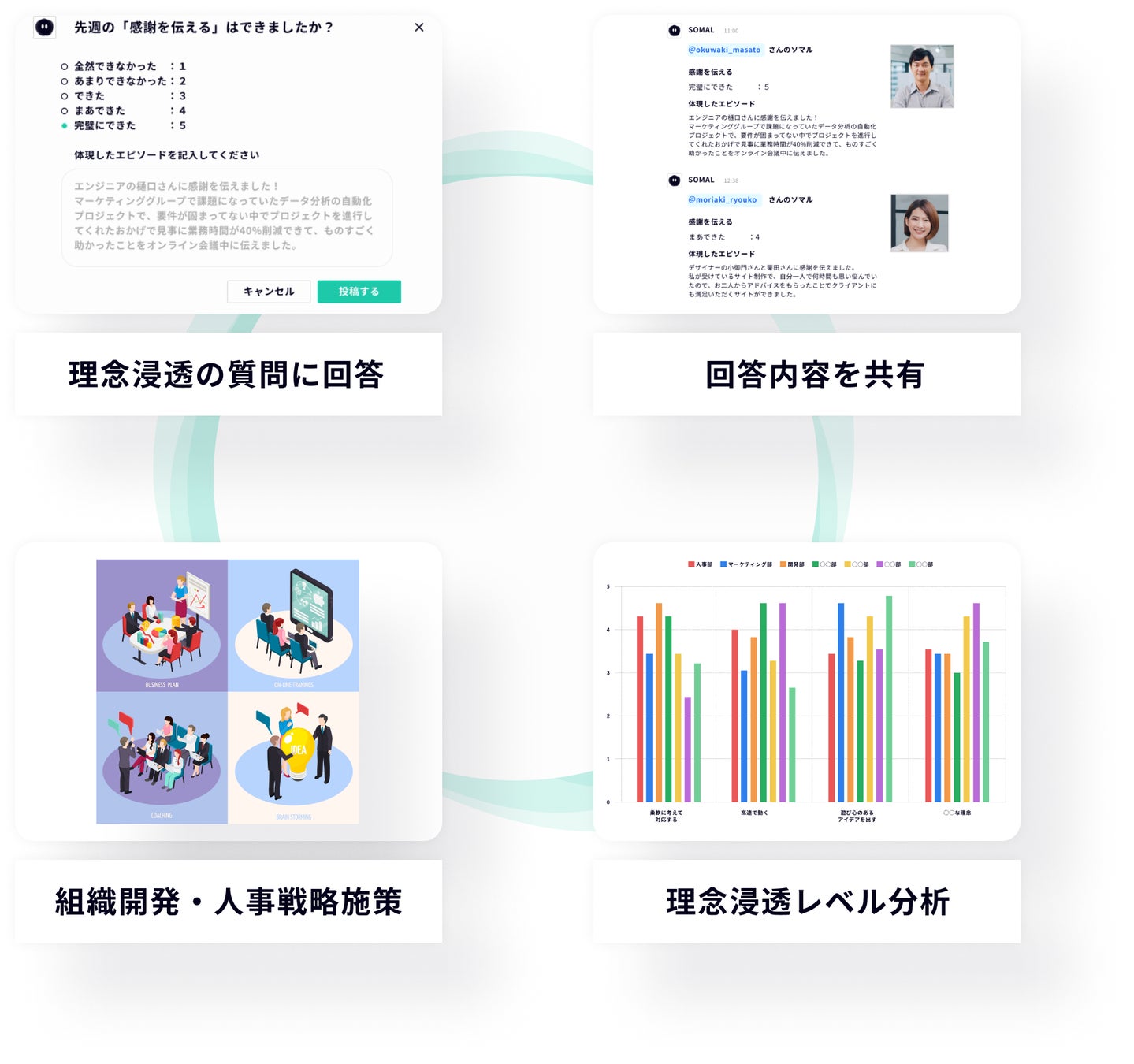 SOMALは、「理念浸透を促す質問に答える→回答内容を全社員で共有する→回答内容を分析する→分析結果から施策を立てる」というサイクルで成り立つ、社員の"行動"によって理念浸透を促すツールです。