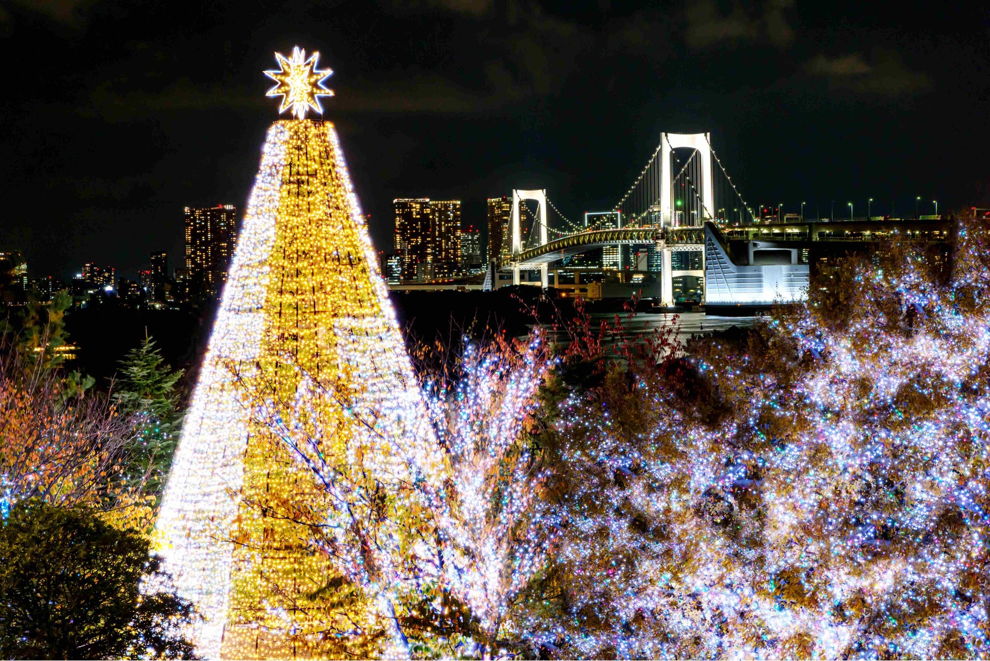施設周辺の樹木とデッキ全体を、光が包み込む「お台場イルミネーション“YAKEI”」は、