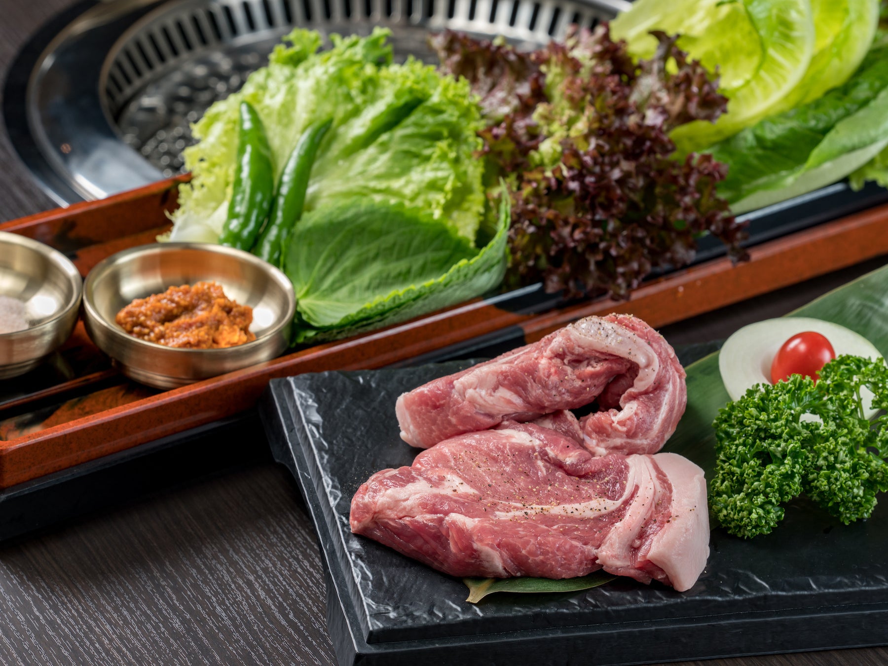 霧島豚は、霧島高原の豊かな自然環境の中で飼育されたブランド豚。栄養満点の豚肉と常時7種前後ものたっぷり野菜と一緒に、ヘルシーにお召し上がりいただけます。卓上のロースターで豚肉にじっくりと火を入れ食べやすい大きさにカットしてから、サンチュ・エゴマの葉・グリーンリーフ・わさび菜・春菊など、7種の葉物野菜と特製の韓国味噌ダレ(サムジャン)、ニンニクと一緒にお味わいください。
