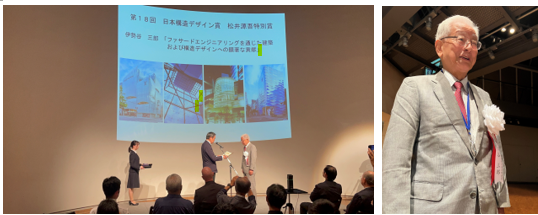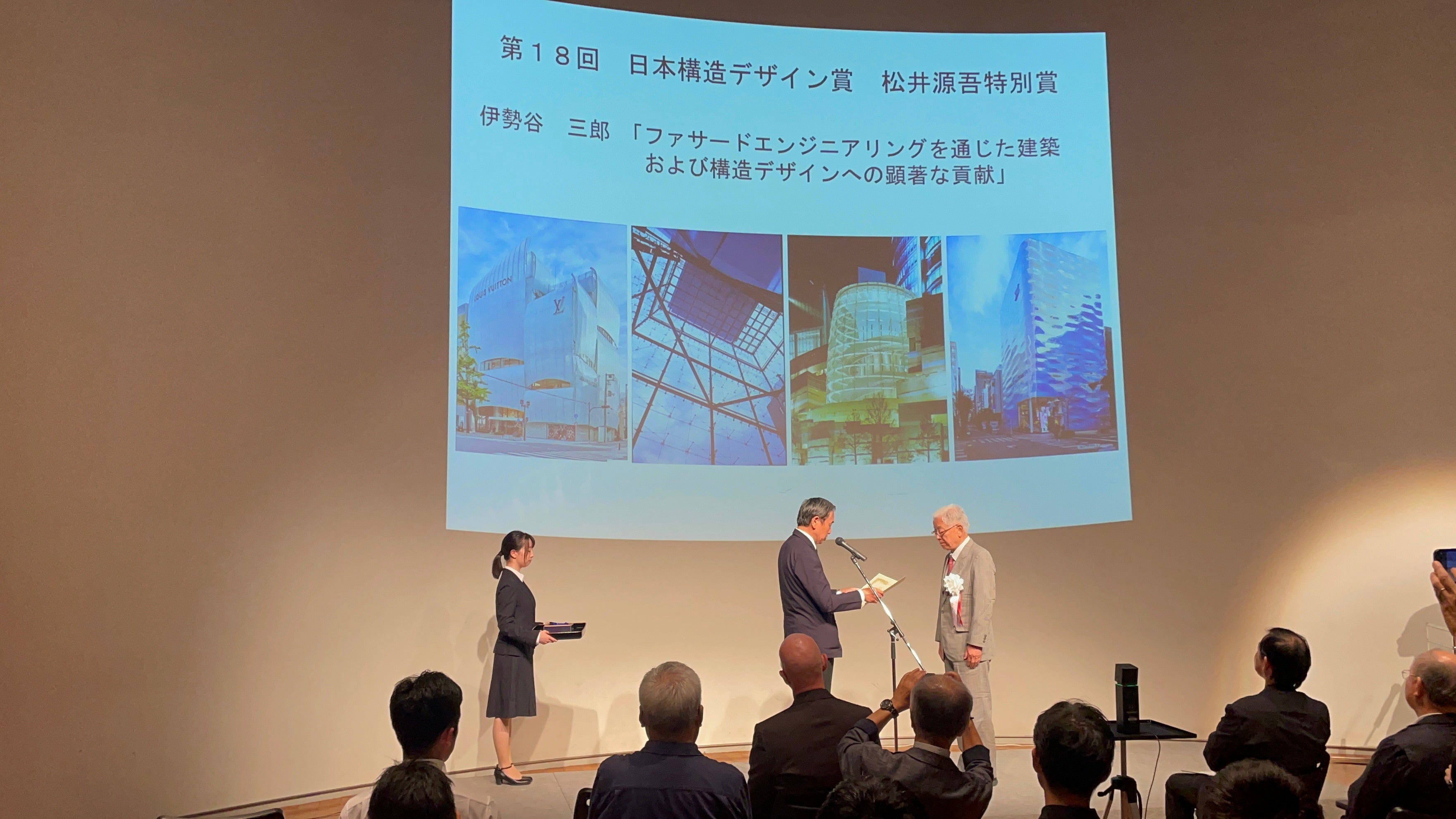 「ファサード・エンジニアリングを通じた建築および構造デザインへの顕著な貢献」を認められ、受賞する運びとなりました。伊勢谷は1966年に旭硝子株式会社中央研究所に入所しガラスの実用強度確認に携わって以来、今もなおガラス・ファサード・エンジニアリングを牽引し続けています。