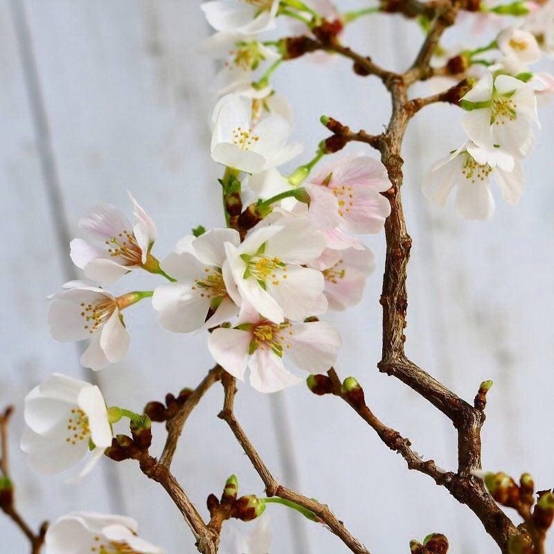 個性的なジグザグの枝に、恥じらうような下向きの淡いピンクの花が付く独特な雰囲気を持つ品種。全国でも切り枝で出荷があるのはJAおおいた様のみで、4月の出荷期にはそのユニークな佇まいが大いに注目を集めました。サクラが自宅用としてコモディティ化している中で、さらに新しい展開が求められた結果といえます。