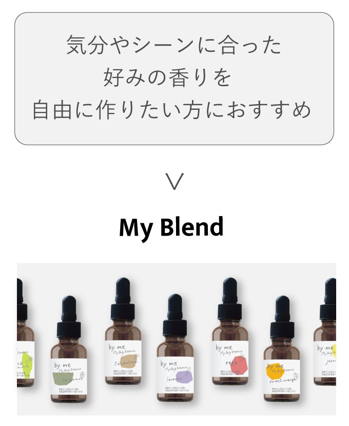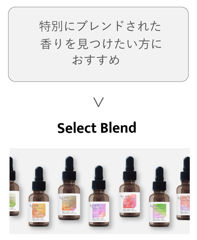 香りのエッセンスを選ぶ際、「My Blend」では豊富な香りレシピから香りを絞り込む機能を、「Select Blend」では独自のアルゴリズムでお客様に香りをおすすめする「by me AI 診断」を提供し、お客様の好みに合った香り選びにさらなる楽しみをプラスします。