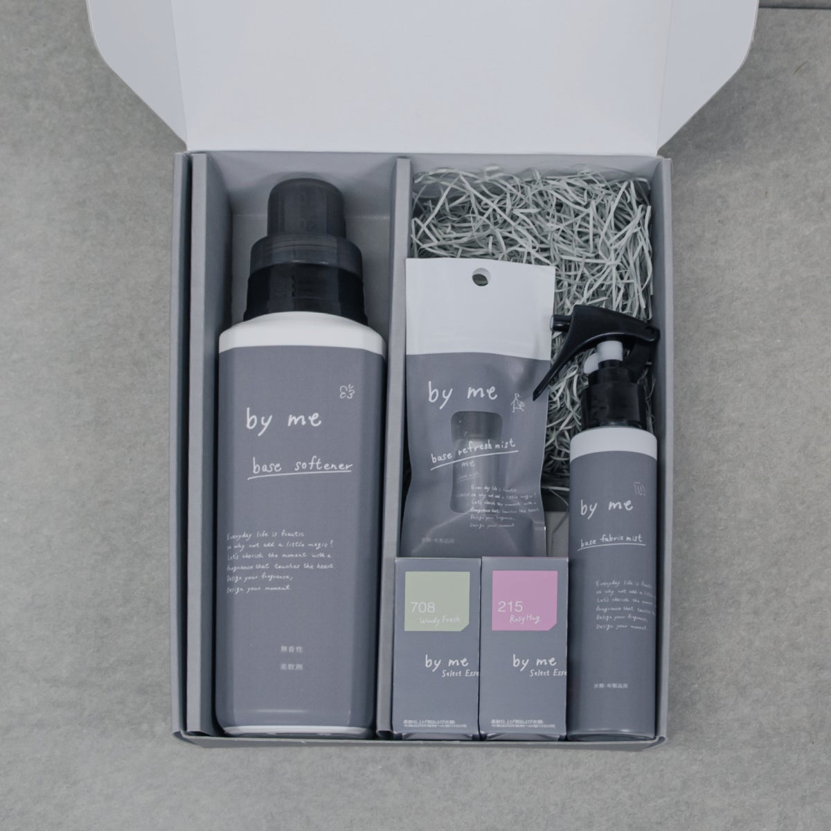 『by me』の定期便では、注文の度に好きな香りのエッセンスを指定することができるので、様々な香りをお楽しみいただけます。