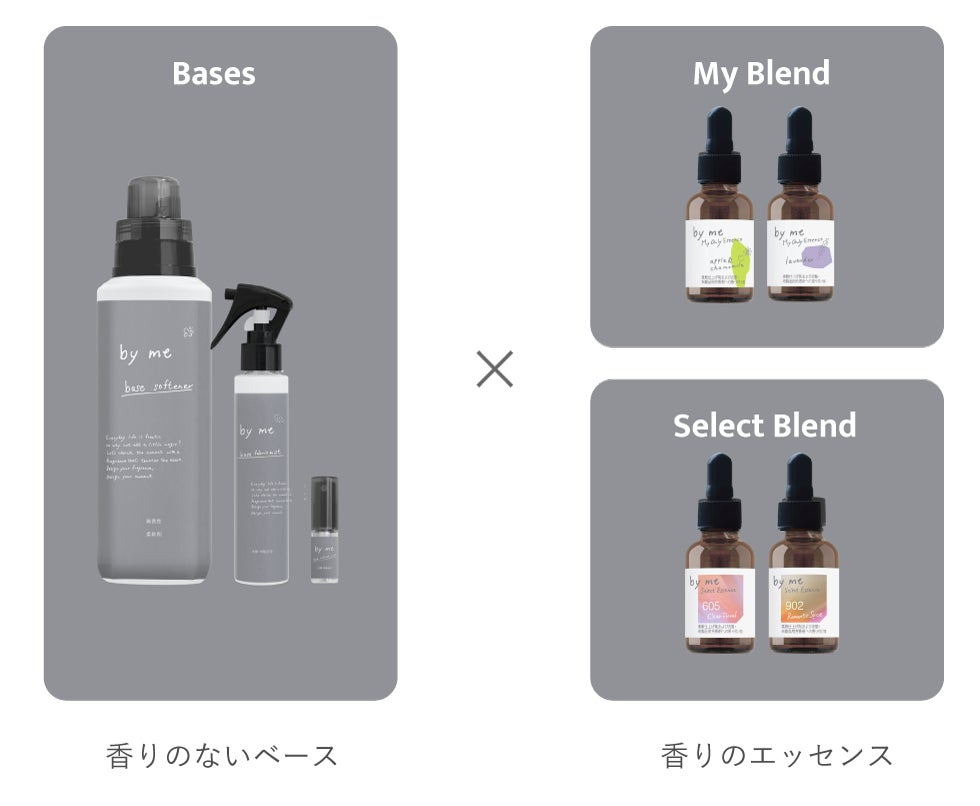 柔軟剤・衣類ミストなどの<無香性のベース>に、好みの香りの<エッセンス>をブレンドすることで、自分に合った香りを自由にカスタマイズできる新ブランド