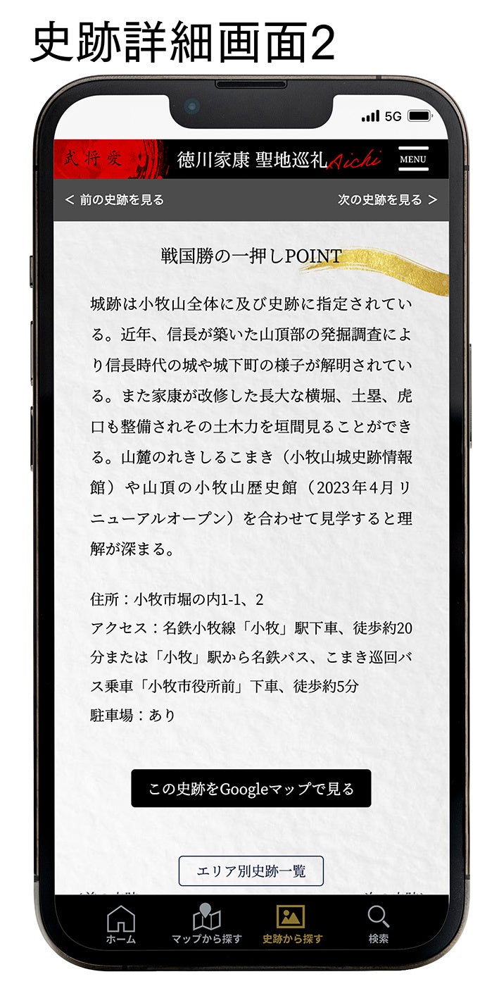 また、MAP・史跡名からも検索が可能。Googleマップと連動することで聖地巡りをスムーズに行えます。