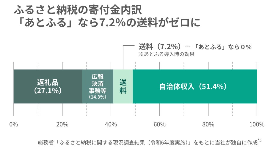 さらに、「あとふる」では返礼品の送付そのものが不要となるため、従来の制度で寄付額のうち平均7.2% *5 が送料に充てられていたコストが発生せず、自治体に残る寄付金の割合が高まる効果も見込まれます。