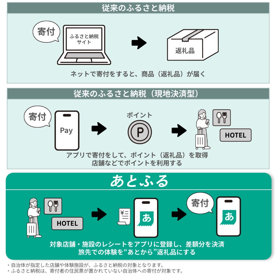 「あとふる」は、利用者が地域を訪問した際に「泊まった」「食べた」「買った」といった地場での体験を、あとからふるさと納税の返礼品(3割相当)*3 として指定し、残りの金額を寄付(7割相当)として納められる新しい仕組みです。