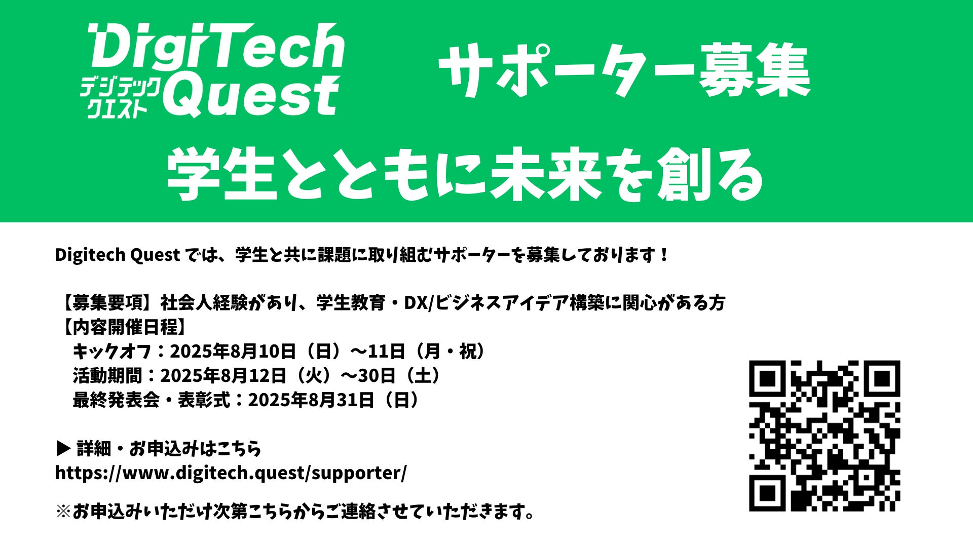 DigitechQuestでは、協賛企業および学生とともに課題に取り組むサポーター企業を募集しております。