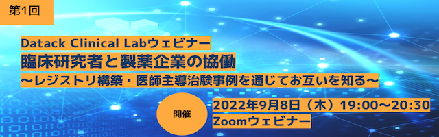 【2022/09/08開催】『Datack Clinical Lab ウェビナー 臨床研究者と製薬企業の協働 〜レジストリ構築・医師主導治験事例を通じてお互いを知る〜』
