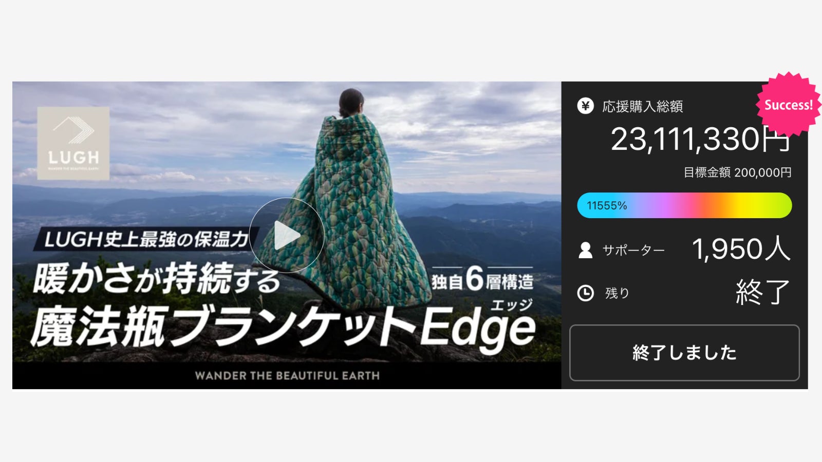 株式会社ジスクリエーション(本社:名古屋市、代表取締役:中濵 淳)は、応援購入サイトMakuakeにて、魔法瓶ブランケット先行販売プロジェクト『【第6弾】車中泊がやめられなくなる。-15℃でも暖かい6層・魔法瓶ブランケット』を実施、1950名のサポーターより2300万円を越える応援購入を頂き、2024年12月に先行して製品をお届けいたしました。