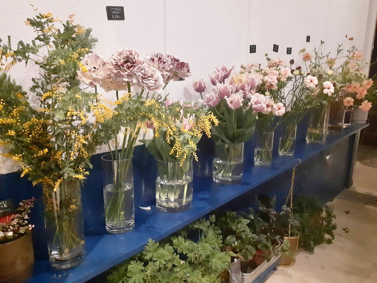 お店の看板には"お花とお酒と"と書かれている通り、素敵なお花が飾られていて購入もできる。