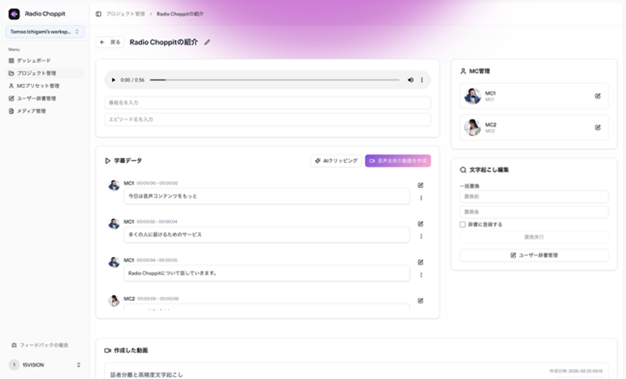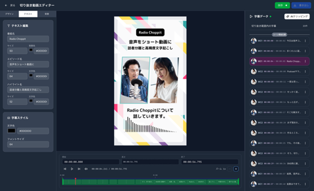 Radio Choppitは、複数話者を識別した文字起こしデータをもとに、話者が分かる字幕付きショート動画を制作できるサービスです。