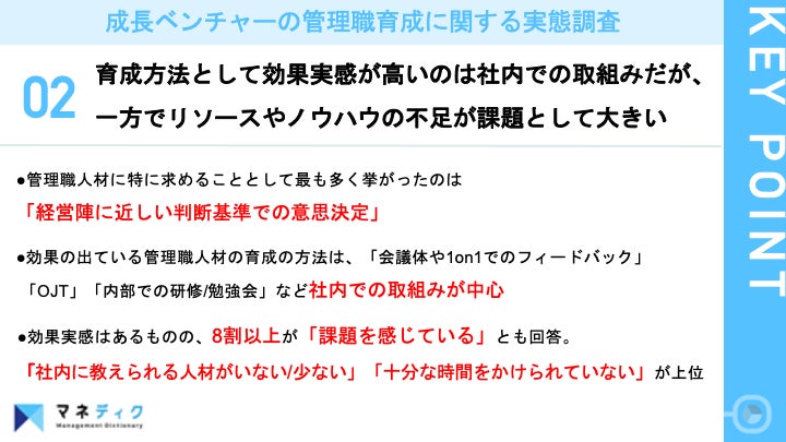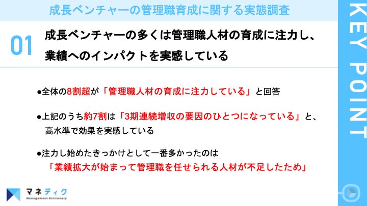 株式会社JAM(本社:東京都港区 代表取締役社長:水谷健彦)が運営する管理職育成の理想を実現するサービス「マネディク」(https://jam.manadic.com/)は、3期連続で増収を達成しているベンチャー企業の経営者/役員101名に対し、成長ベンチャーの管理職育成に関する実態調査を実施いたしましたので、お知らせいたします。