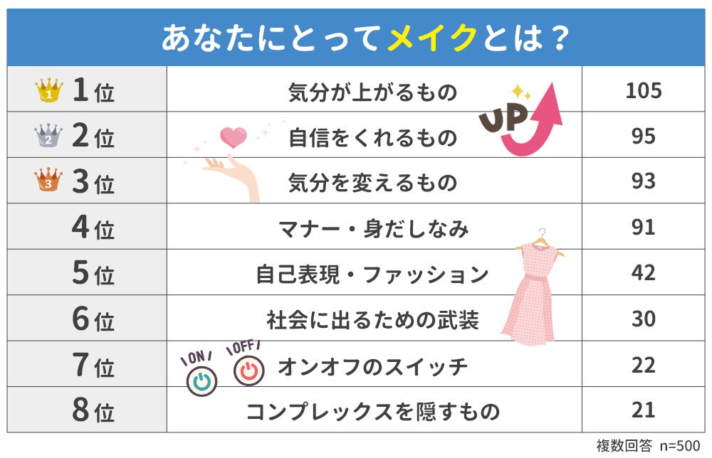 「気分が上がる」「自信をくれる」など、メイクが女性の気持ちに大きく影響していることがわかります。