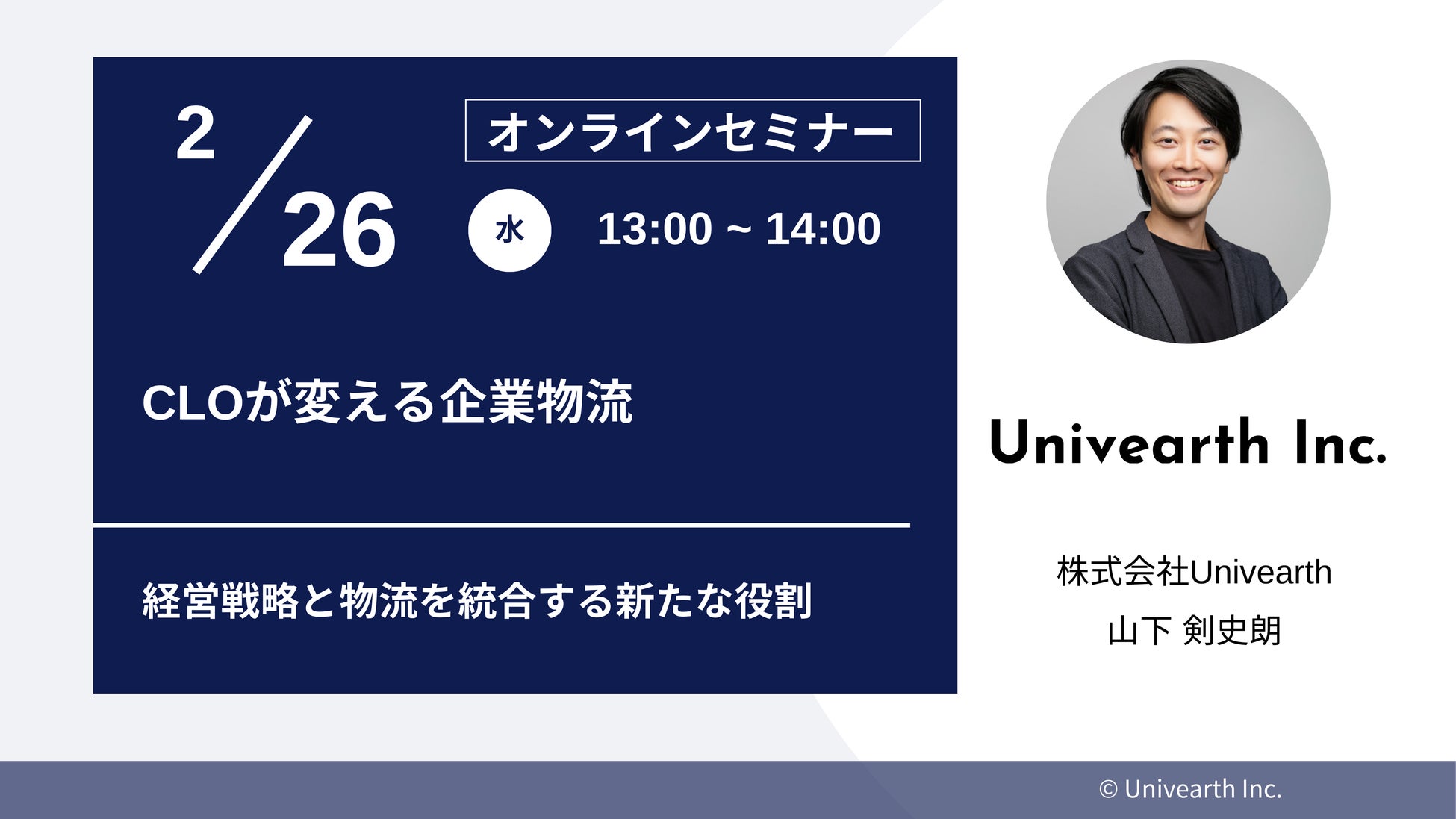 企業の物流戦略支援を行う株式会社Univearth(本社:大阪府大阪市北区、代表取締役:谷口 臨太朗)は、2026年4月からのCLO(Chief Logistics Officer)選任義務化に向けて、物流を経営戦略レベルで捉え直すためのオンラインセミナー「CLOが変える企業物流 〜経営戦略と物流を統合する新たな役割〜」を開催いたします。