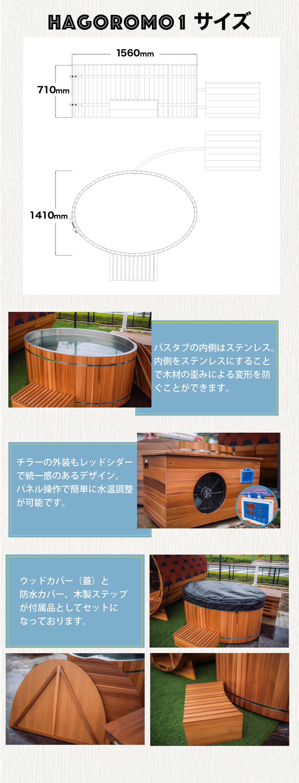 セット内容:バスタブ×1、チラー×1、ウッドカバー(蓋)×1、防水カバー×1、木製ステップ×1