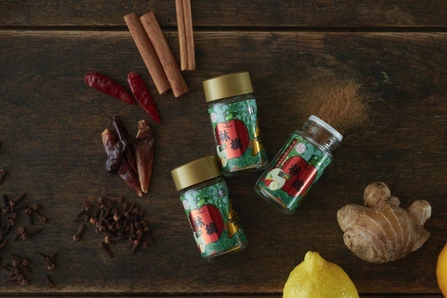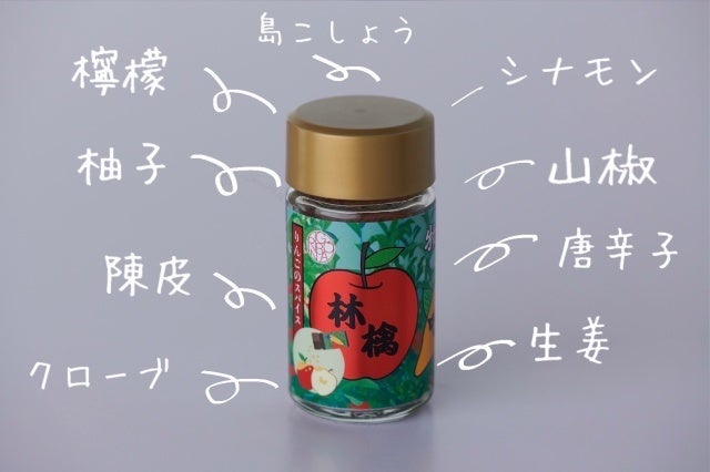 「りんごにかけるスパイス」は、シナモンをベースにレモン、陳皮、万願寺唐辛子、生姜、柚子、山椒、島こしょう、クローブが入っています。調理過程で入れたり、最後に一振りするだけで、甘いだけではなく深みを感じられる大人りんごスイーツが出来上がります。