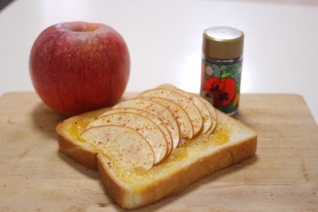 パンにバターを塗って、スライスしたりんごを乗せて、2分トースト。その後スパイスを適量ふりかけます。