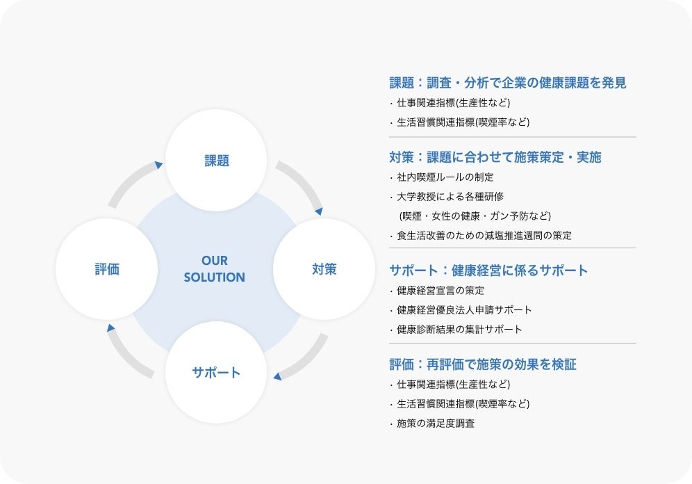 ・従業員の健康課題の可視化(生活習慣、ワーク・エンゲージメント、アブセンティーズム、プレゼンティーズム 他)