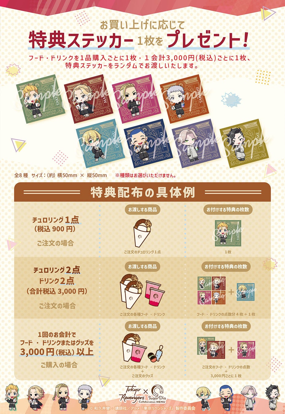 開催期間中、ハッシュタグ #toman_anime #東リべ #SugarDia と一緒にコラボメニューの写真をSNSに投稿し店頭でご提示いただくと、コラボメニューご注文特典のステッカー(全8種)をランダムでもう1枚プレゼントいたします。