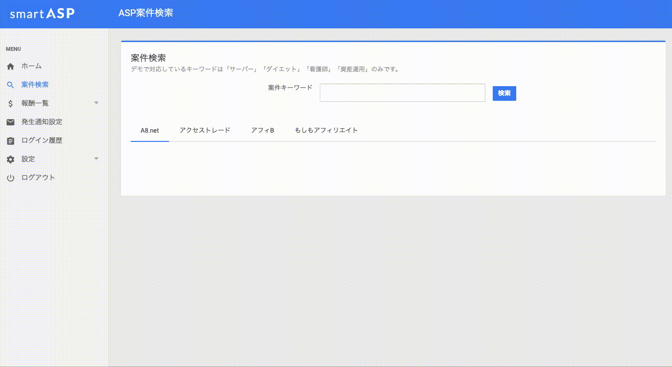 「サービスご利用まで約3分の今すぐに始められるサービス」の【smart ASP】では各々のASPの案件を一括で検索でき、その場で案件の提携まで行うことができ、売り上げの管理もsmart ASP内で確認することが出来、日々の業務の自動化が可能です。