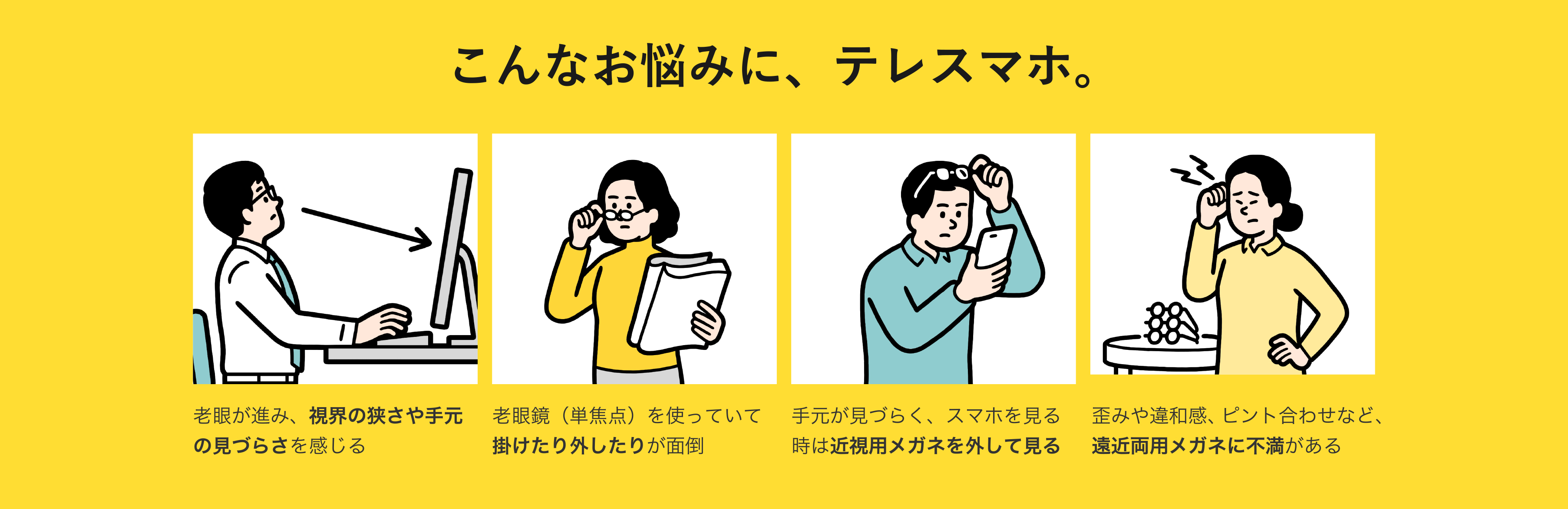 「テレ」ビから手元の「スマホ」までラクに見ることができる、屋内・室内向けメガネレンズです。日常生活で、もっともよくみる頻度が高いのは数メートル先の「中間距離」から「手元」までです。また老眼で見えにくくなってくるのもこの距離です。テレスマホは、この距離を見渡しやすい設計をベースに、より広くクリアな視界と、ラクなピント合わせを実現しました。