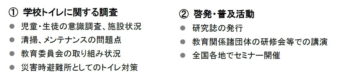公立小中学校施設が老朽化のピークを迎える中、学校では、施設の長寿命化を図る老朽化対策とともに、学校施設の多様なニーズに応じた教育環境の向上との一体的整備が急務になっています。学校のトイレ研究会では、全国自治体のアンケート結果や各地の先進的な取り組み事例紹介を通して、子供たちや地域住民の皆さんが安心して利用できる「学校のトイレづくり」を啓発してまいります。