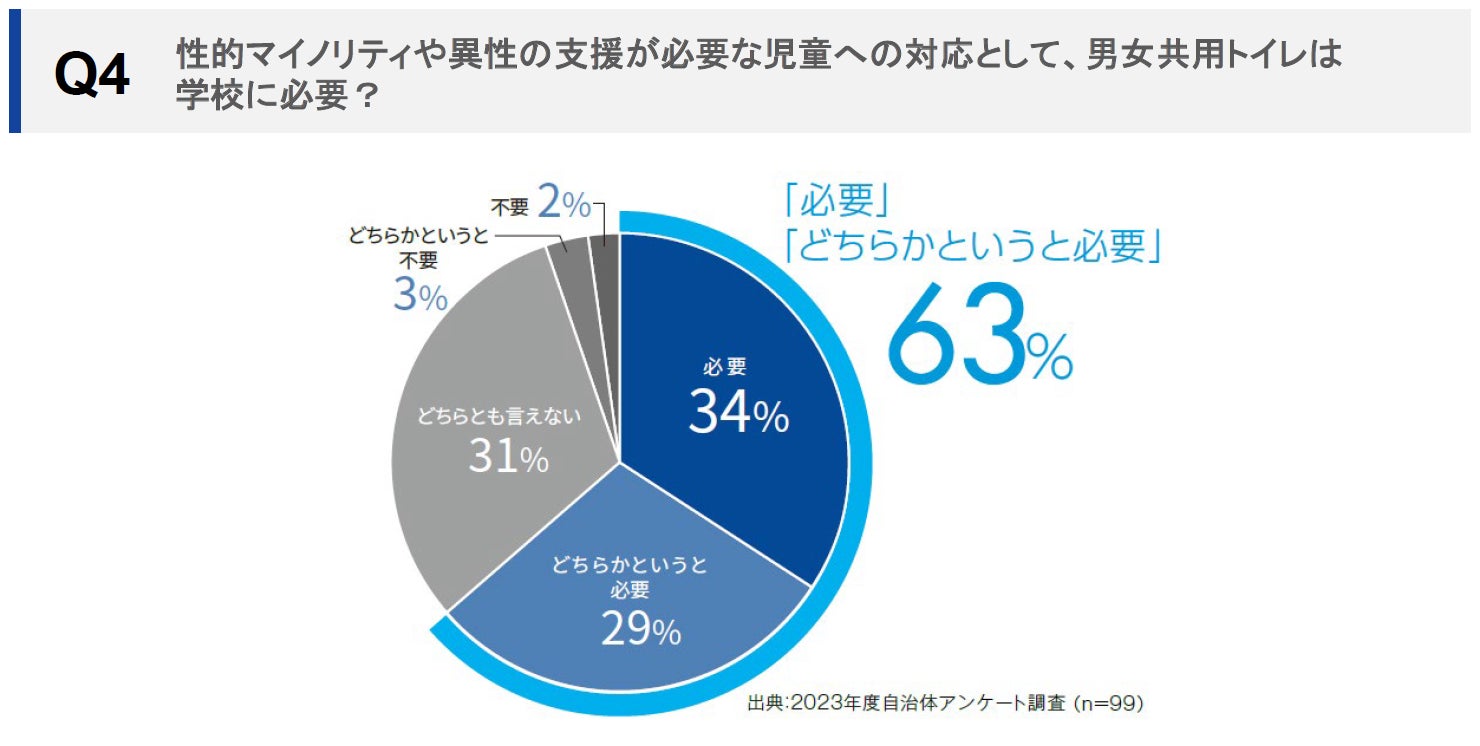 性的マイノリティや異性の支援が必要な児童への対応として、男女共用トイレは「必要」「どちらかというと必要」が63%となっています。