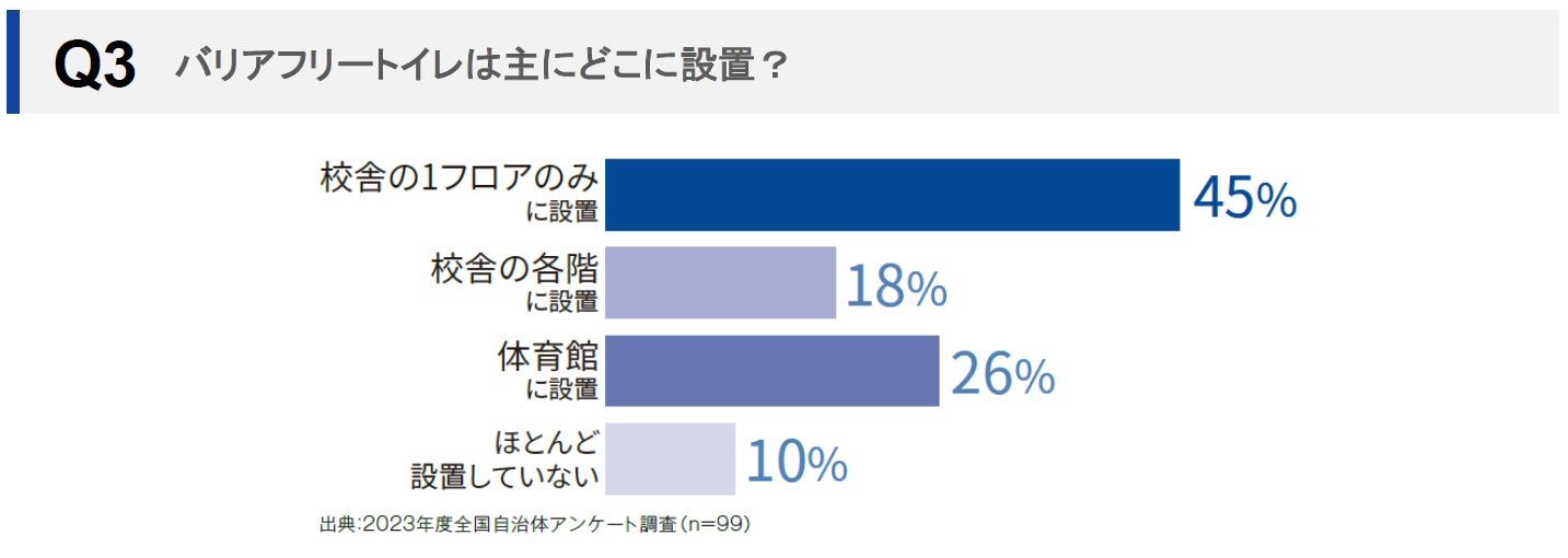 バリアフリートイレの設置場所について、「校舎の1フロアのみ」が45%、「校舎の各階に設置」が18%、「体育館に設置」が26%と、複数箇所への設置はまだ少ないという結果になりました。
