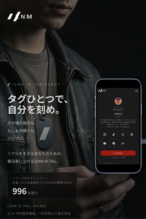 株式会社ダースー(代表取締役:須田 大輔)は、リアルな場で生まれる接点を自然に残し、緊急時の備えにもなる新しいIDタグ「IZNM ID TAG」の予約販売を、公式サイト(https://iznm.jp)にて2026年4月10日(金)より開始します。価格は4,980円(税込)。商品の発送は2026年5月初旬より順次開始予定です。また、予約販売開始を記念して、先着1,000名様にFOUNDER権限を付与します。