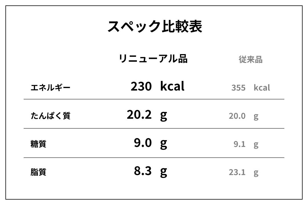 従来品は21.3gと脂質が高めとなっていましたが、今回のリニューアルで8.3gと約61%オフに成功しました。