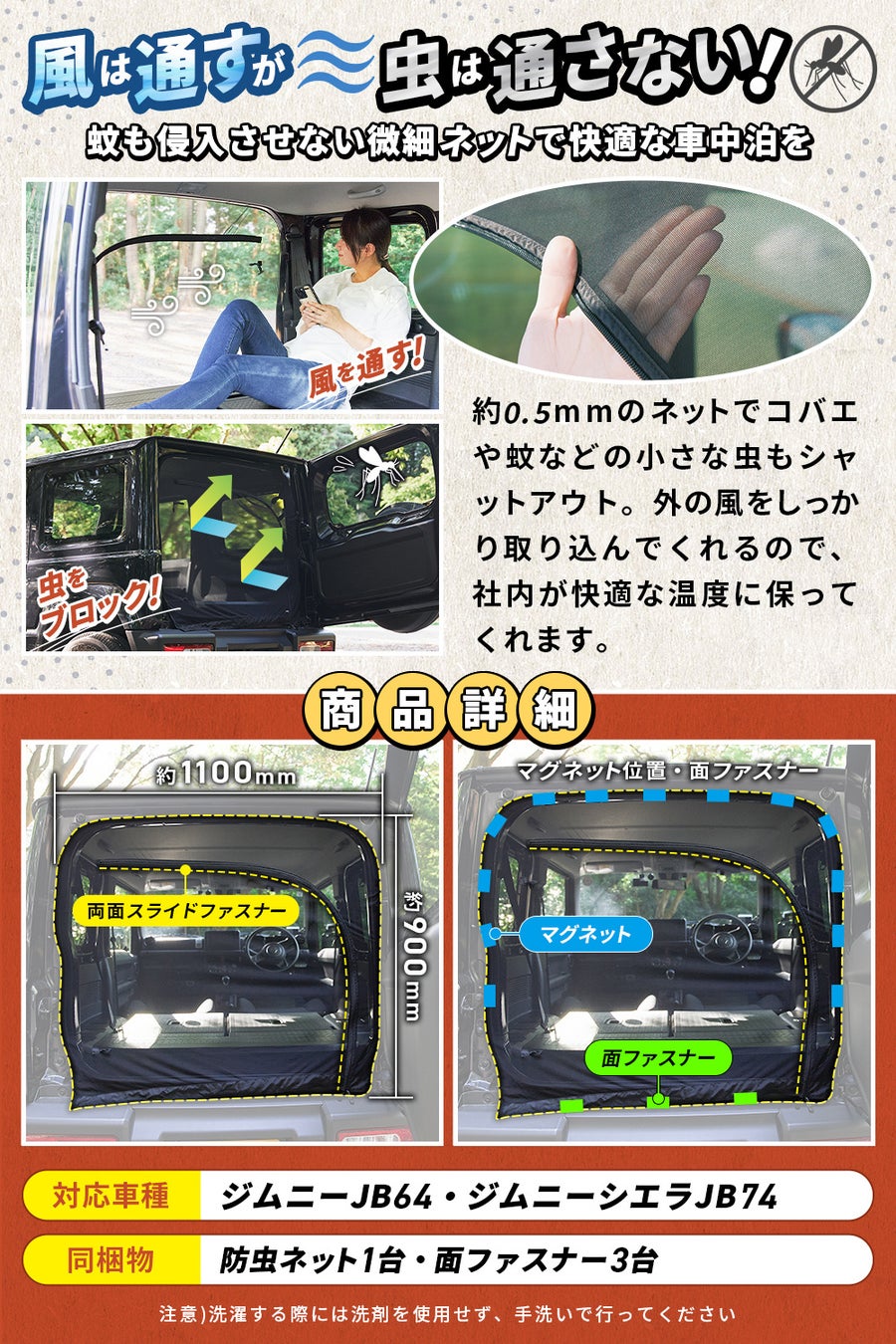 試作時に苦労したのが「風は通すけど、虫は通さない」網の目を0.5mmにすることで、小さな虫をシャットアウト。涼しい風は入ってくるので快適な車中泊を楽しむことができます。