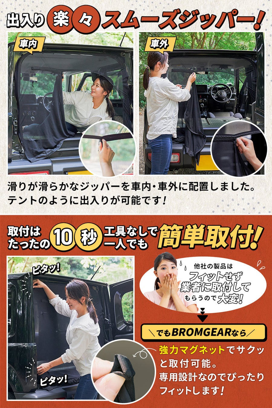 ジッパーは車内外から開けることができて、スムーズに開けられるようにしています。女性でも工具なしで10秒で取付できるようにマグネット式を採用しました。ジムニー専用設計なのでぴったりフィット。一人でも簡単に取り付け可能です。