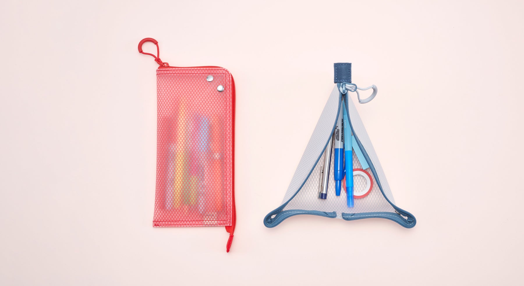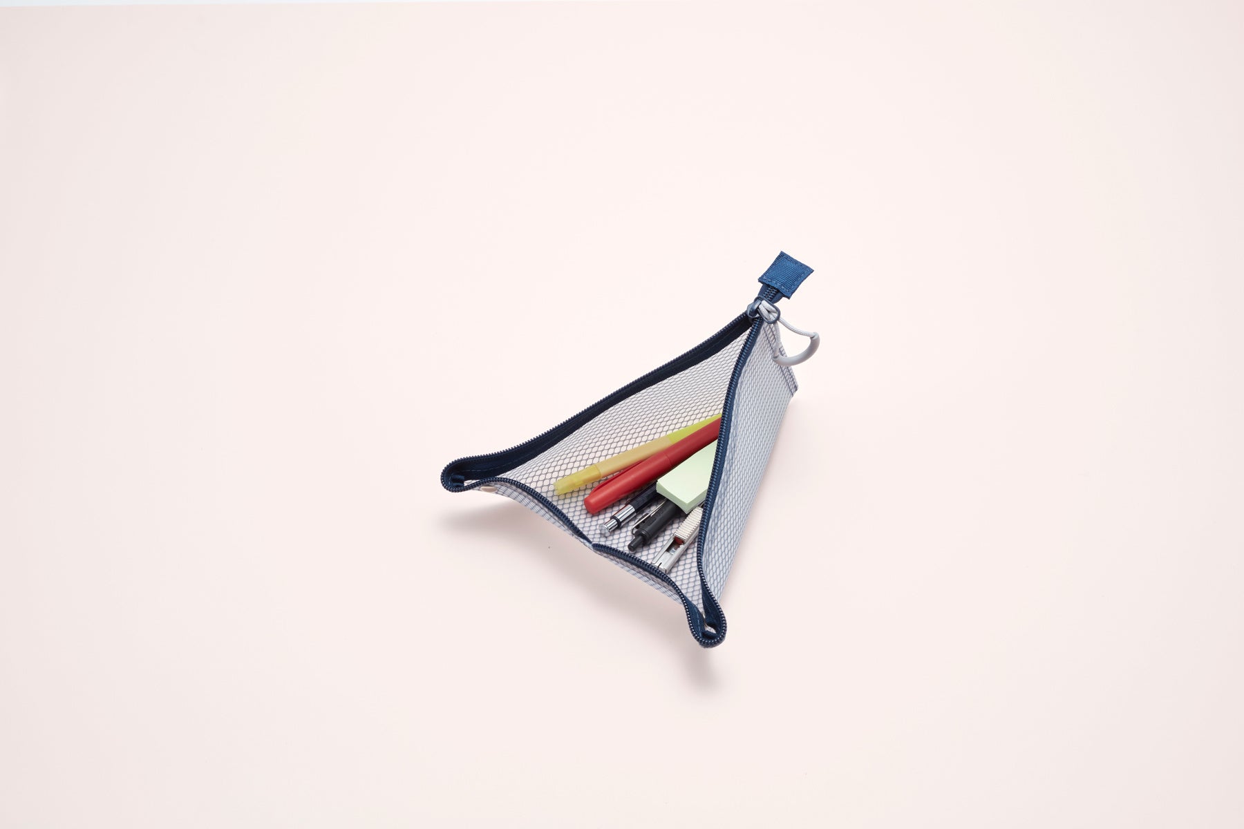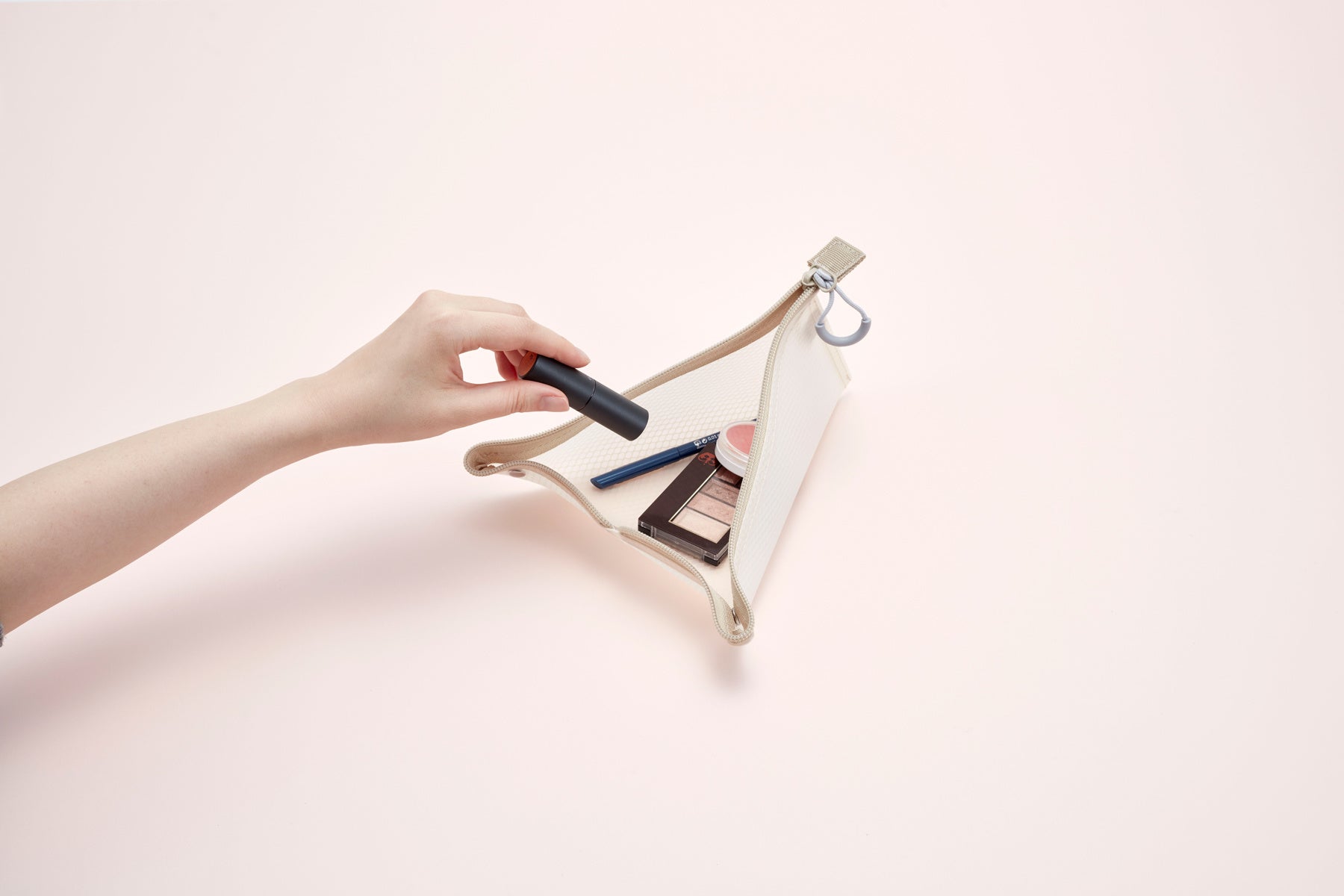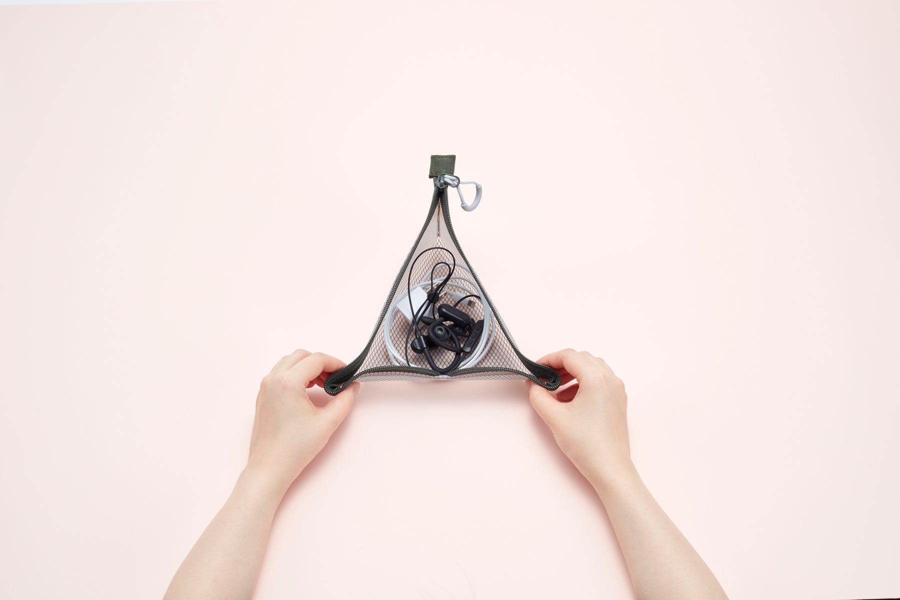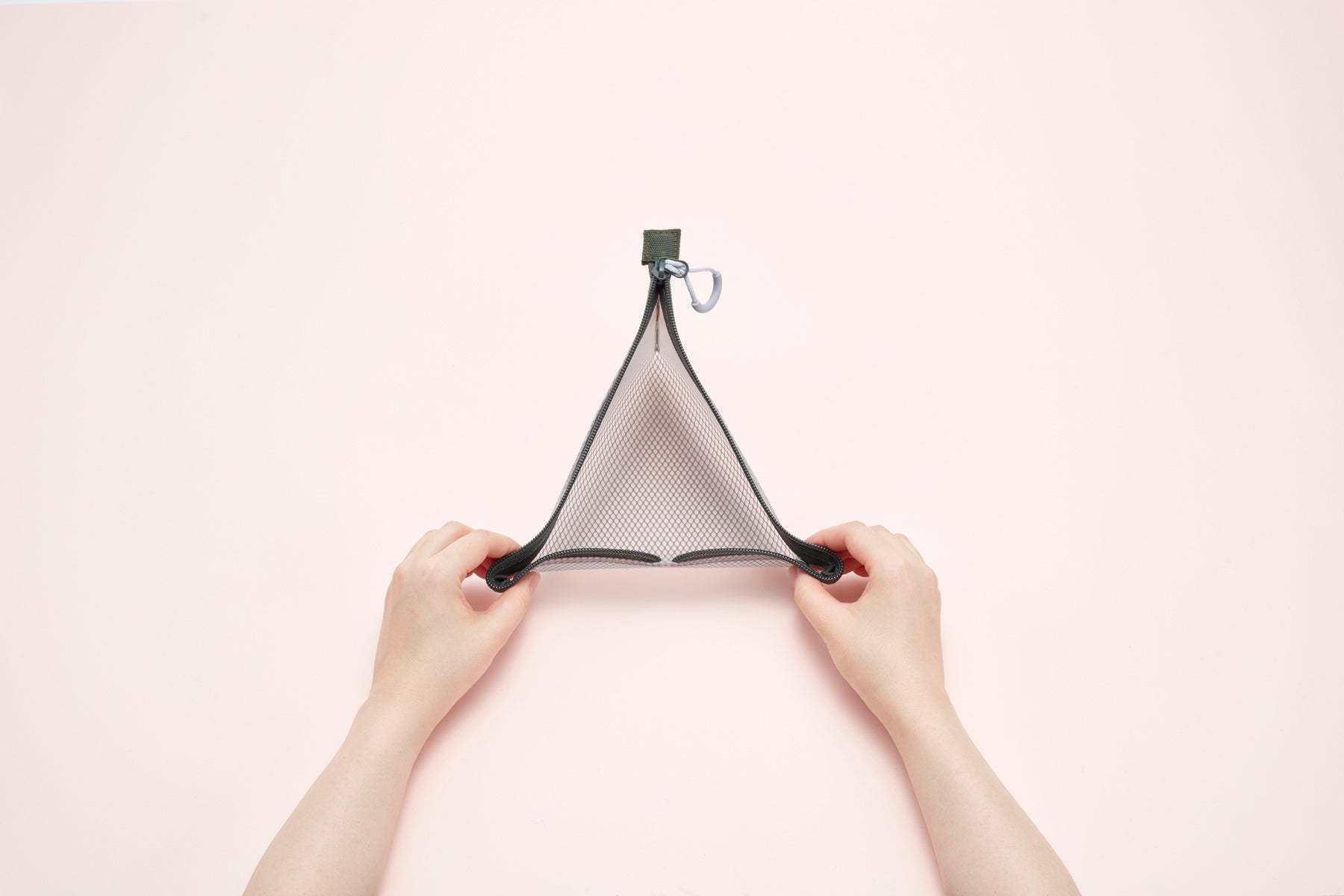 ファスナーを開いてホックをとめると三角形のトレーになるポーチでどこでもMYスペースを。