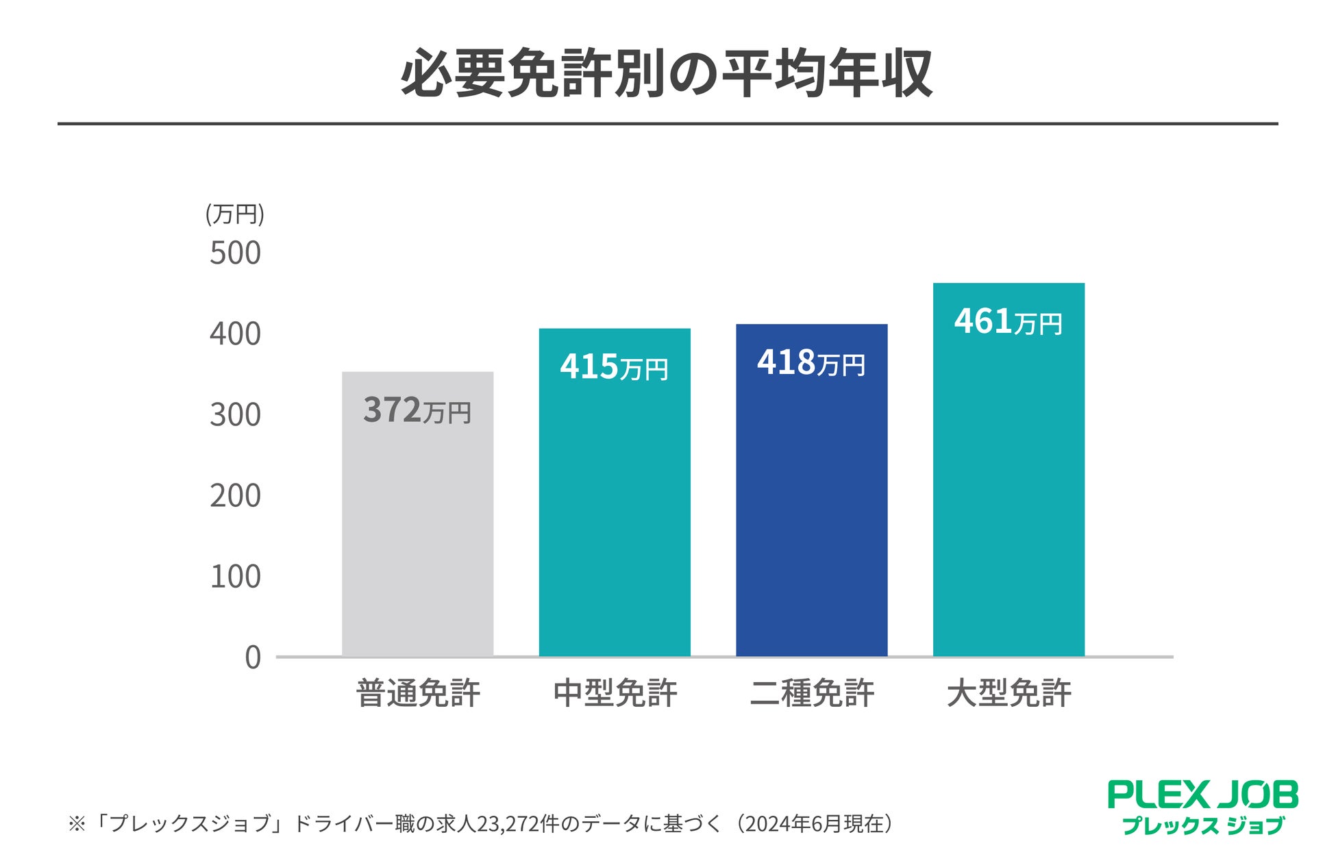 プレックスでは、物流・建設業界を中心に人材採用を支援するサービス「プレックスジョブ」(サービスサイト:https://plex.co.jp/plexjob、求人サイト:https://www.plex-job.com/)が保有する求人データから、免許の有無による平均年収の差を集計しました。