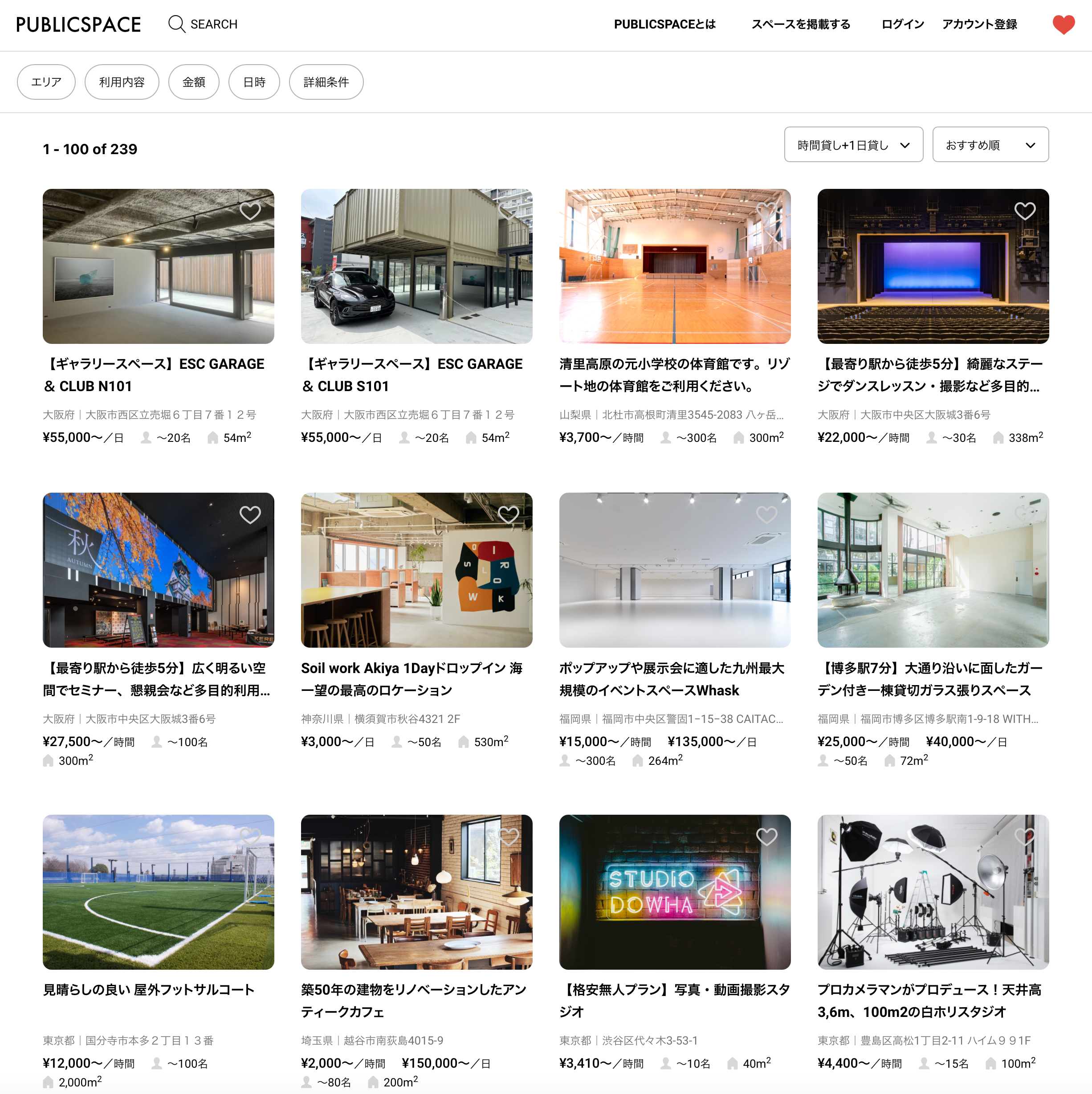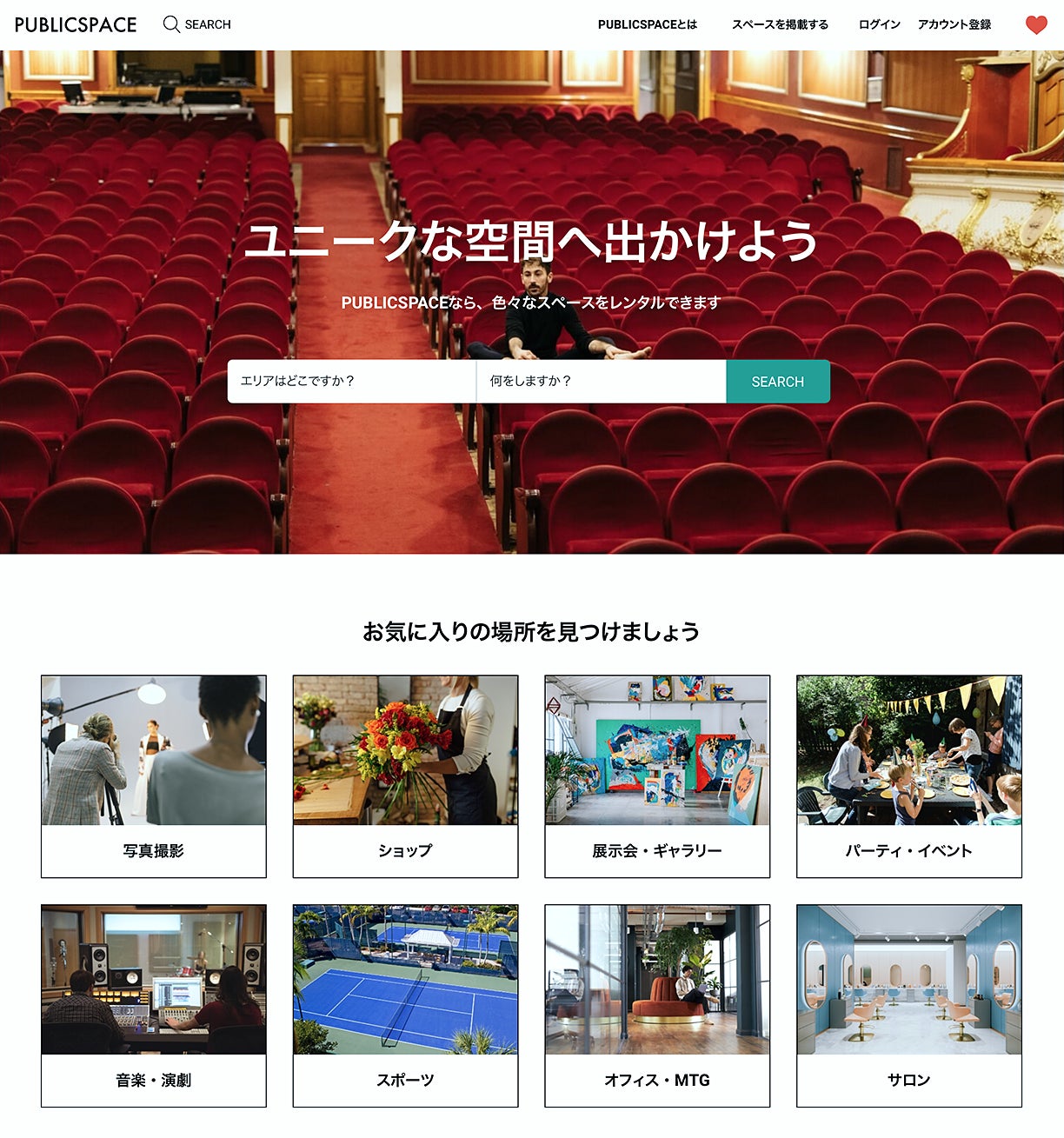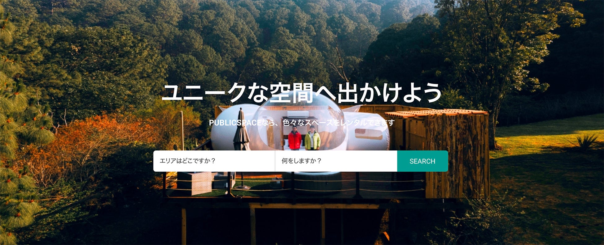 PUBLICSPACEはスペースを短い期間「貸したい人」と「利用したい人」をマッチングするサービスです。街や自然の中にある空いているスペースを「時間単位」または「日単位」で貸し出すことができ、利用したい方は希望の条件に合うスペースを検索し、借りることができます。例えば、休日のレストランで映画の撮影をしたり、天気の良い日に屋上でヨガ教室を開いたり、広大な牧場で結婚式などのパーティをしたり、空っぽの古い倉庫をアートイベントに使用したり、地方のシャッター街の一区画で週末だけお店を開いたりなど。空いているスペースを一時使用という形で幅広く円滑に貸し借りできるようにするサービスです。