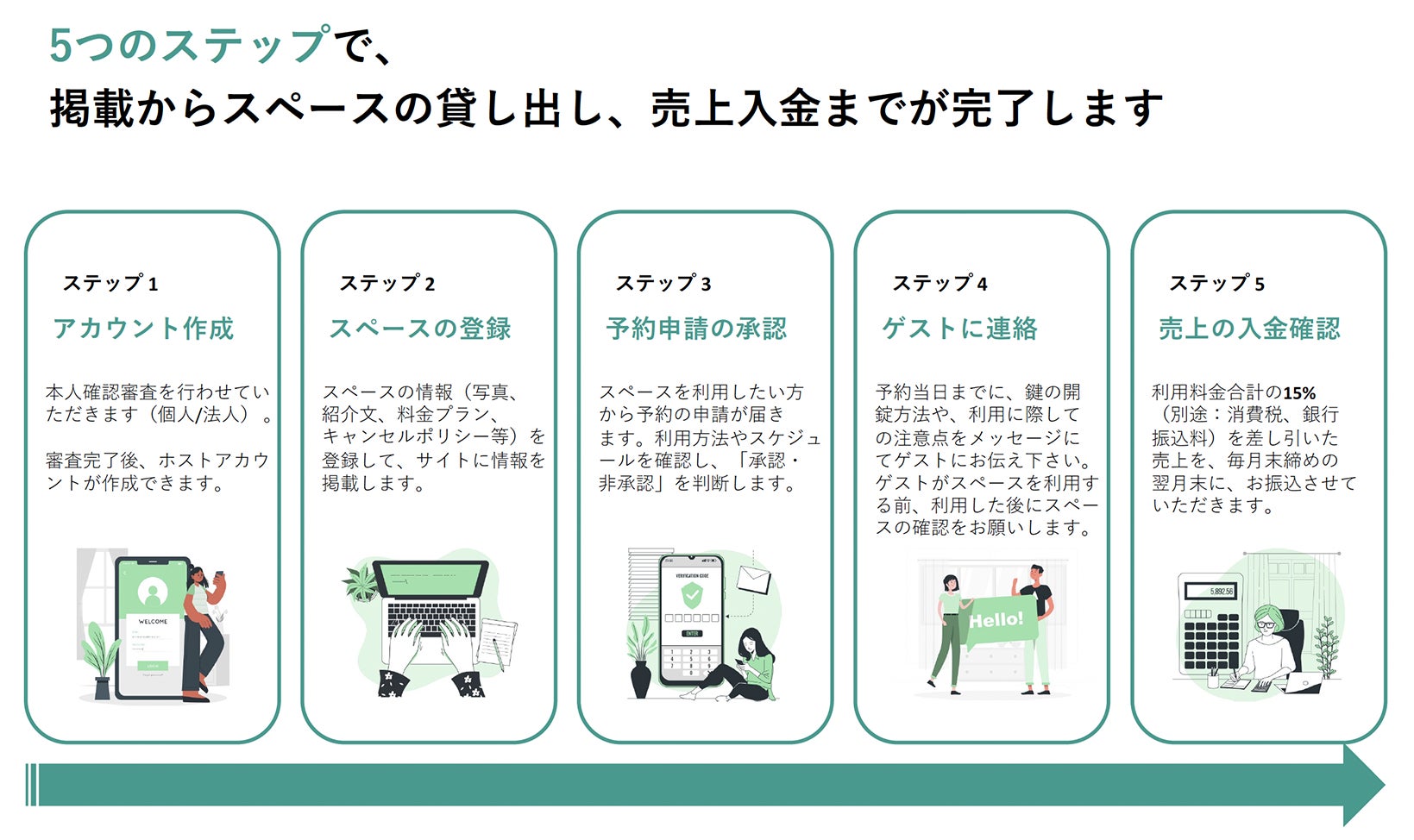 サイト利用の費用に関しては、掲載料や初期登録料などは一切なく、スペースが利用された際に利用料金合計の15%(税別・銀行振込料別)をサイトにお支払いいただきます。