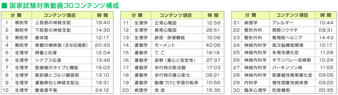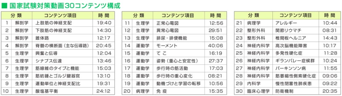 | ・国試対策に特化した講義 | 重要分野、苦手分野から厳選された30コンテンツを用意しています。 |