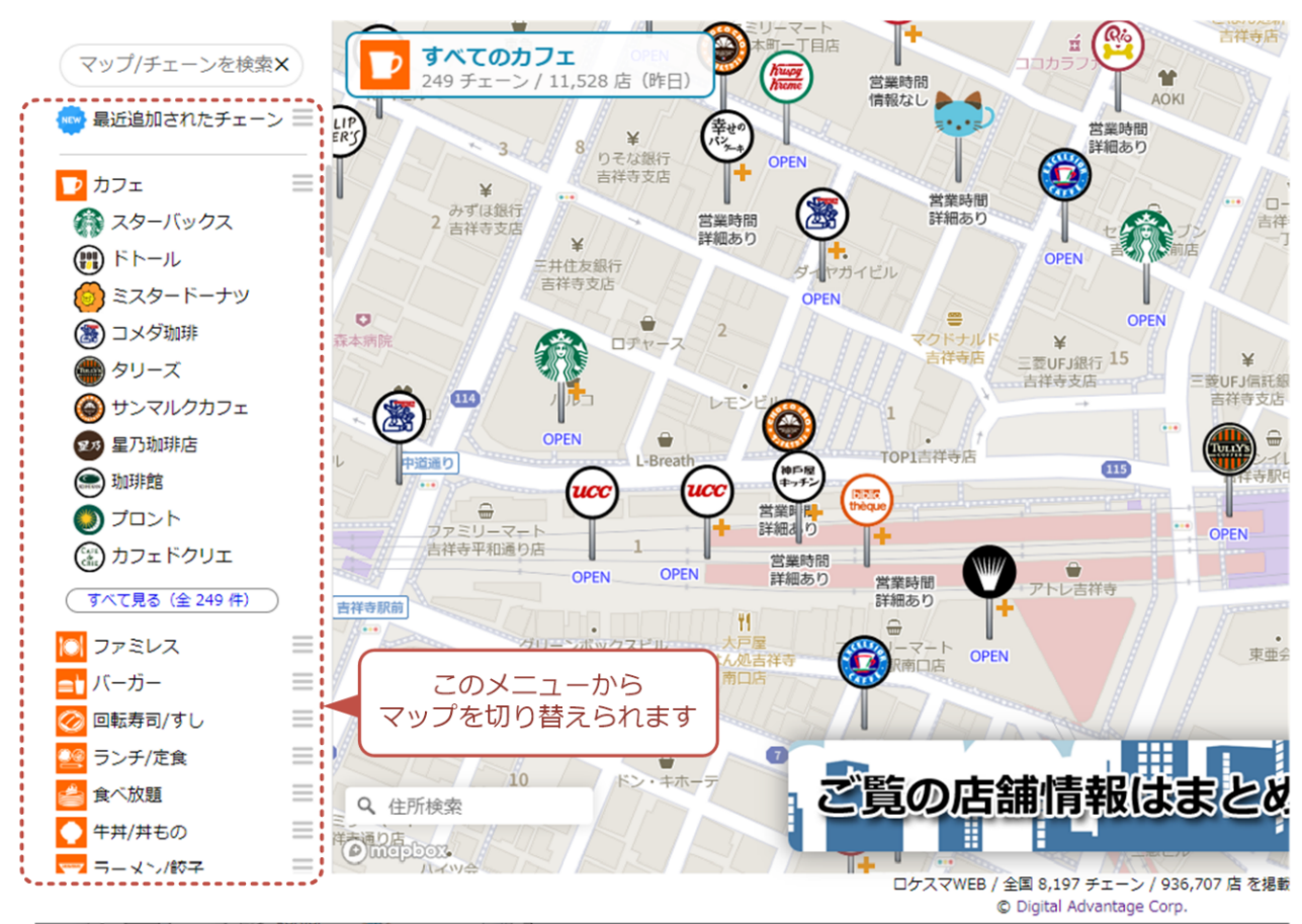 従来のロケスマWEBでは、たとえばコンビニからドラッグストアのマップに切り替えるには、いったん「他のマップ」ボタンをクリックしてカテゴリ/チェーン一覧を表示させる必要がありました。これに対しロケスマWEB Ver.2.0では、画面の左側にカテゴリ一覧を表示して、ここからマップを切り替えられるようになりました。