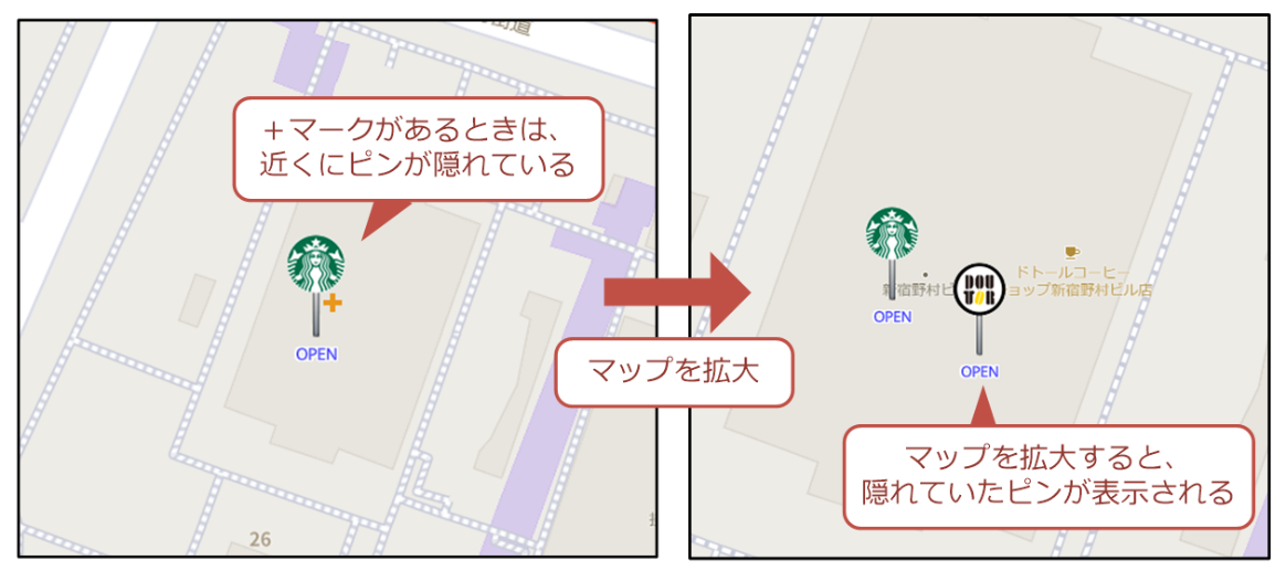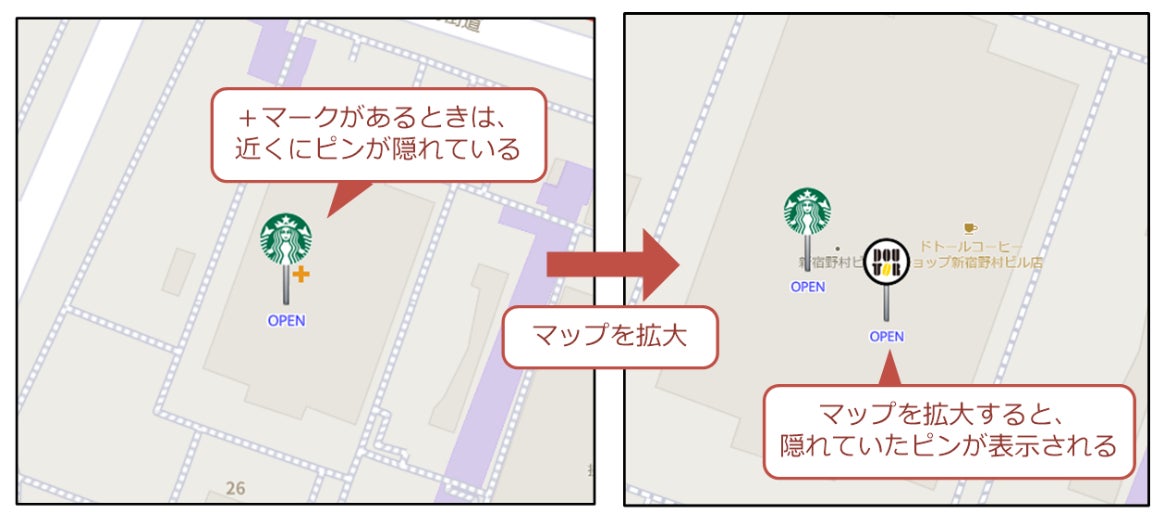 従来のロケスマでは、表示すべき店舗ピンが多すぎる場合、一部のピンを間引いて非表示にすることで、表示速度と背景のマップの見やすさを両立していました。しかしこの方法では、間引かれた店舗が本当に存在しないのか、ロケスマの表示の都合で非表示なのか分からない場合がありました。ロケスマWEB Ver.2.0では、間引かれて非表示になったピンが存在する場合は、近くで表示されているピンの右下に小さく「+」マークを表示します。「+」マークが表示されている場合は、近くに非表示になっているピンがあるという意味ですので、「+」マーク表示が消えるまでマップを拡大するなどすれば、すべての店舗ピンを表示できます。