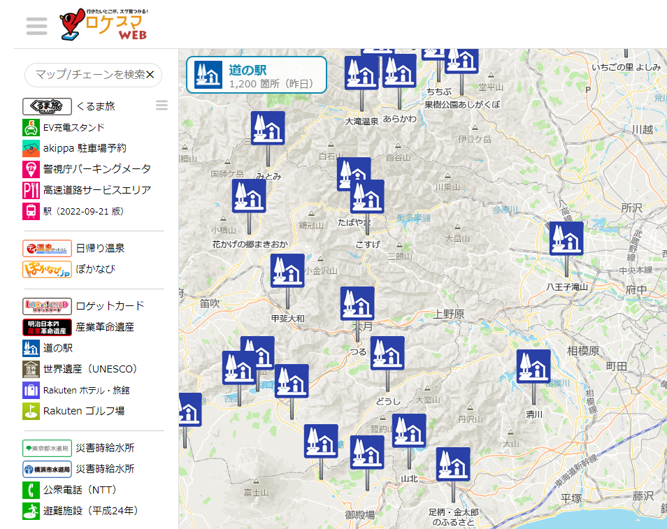 これまでアプリ版のロケスマのみで利用可能だった、「道の駅」や「日帰り温泉」「EV充電スタンド」「ロゲットカード」など各種運営会社との協業によるコラボマップ(当社が独自収集したチェーン店データではなく、外部からデータ提供を受けて作成したマップ)が、ロケスマWEB Ver.2.0でも表示されるようになりました。
