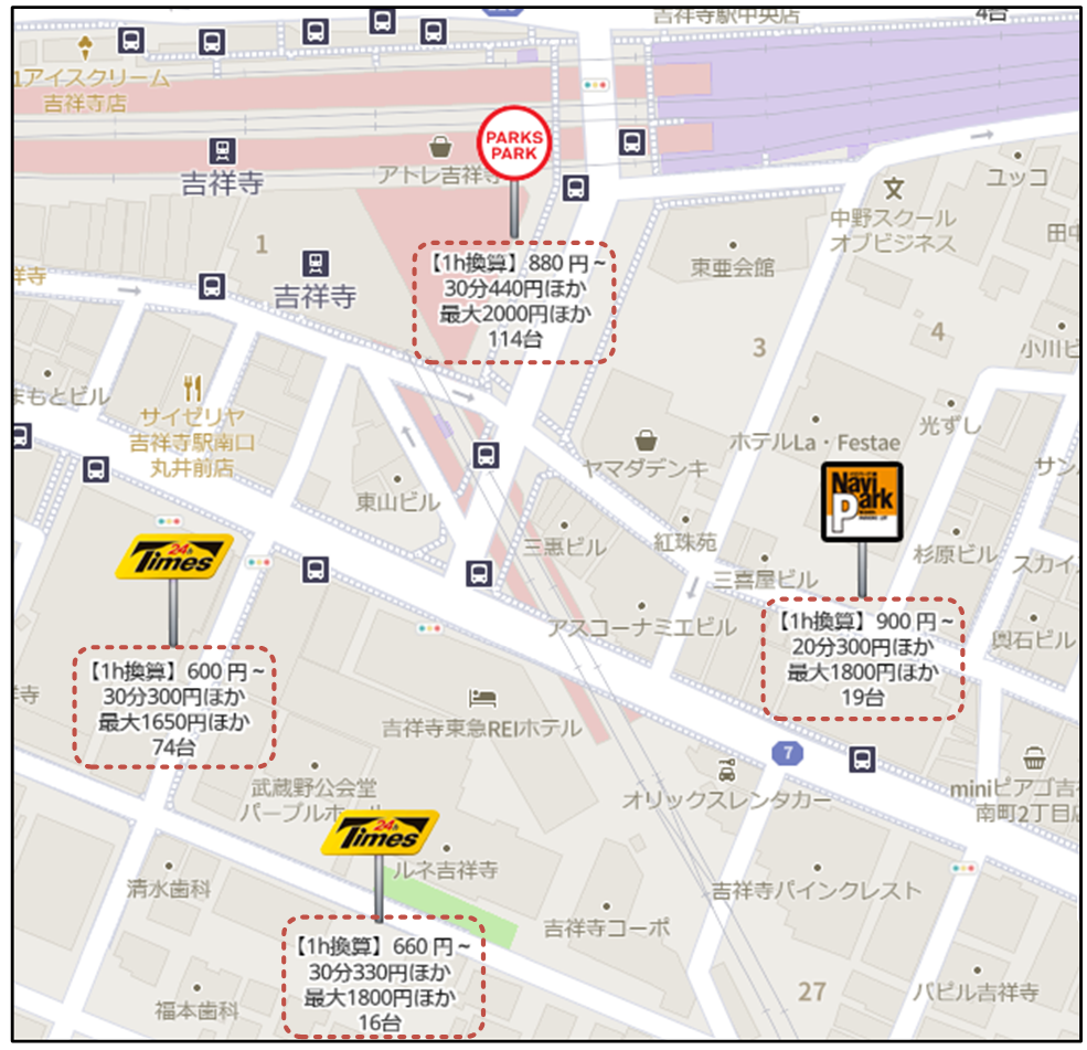 ロケスマWEB Ver.2.0では、ピンの下に付加情報を表示します。例えばドラッグストアやスーパーなどの店舗では、現在営業中であれば「OPEN」、営業が終了していれば「~23:00」(すでに23:00で閉店した、という意味)のように表示されます。