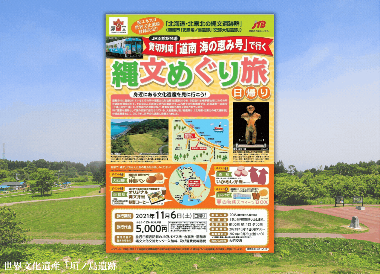 函館スイーツ推進協議会は、函館縄文スイーツ・プロジェクトの一環として、株式会社JTB北海道事業部との共同企画により、縄文にちなんだグルメやスイーツなどを堪能しながら、函館市に所在する世界遺産「垣ノ島(かきのしま)遺跡」などを訪れて縄文ワールドに浸る日帰り周遊ツアー「貸切列車『道南 海の恵み号』で行く縄文めぐり旅」を、2021年11月6日(土)に催行いたします。