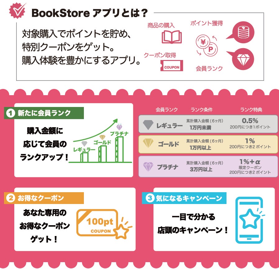 「BookStore」アプリをご利用いただくことで、より便利に・よりお得なサービスが提供できるようになりました。スマートフォンだけで会員サービスを利用でき、以下の特徴があります。