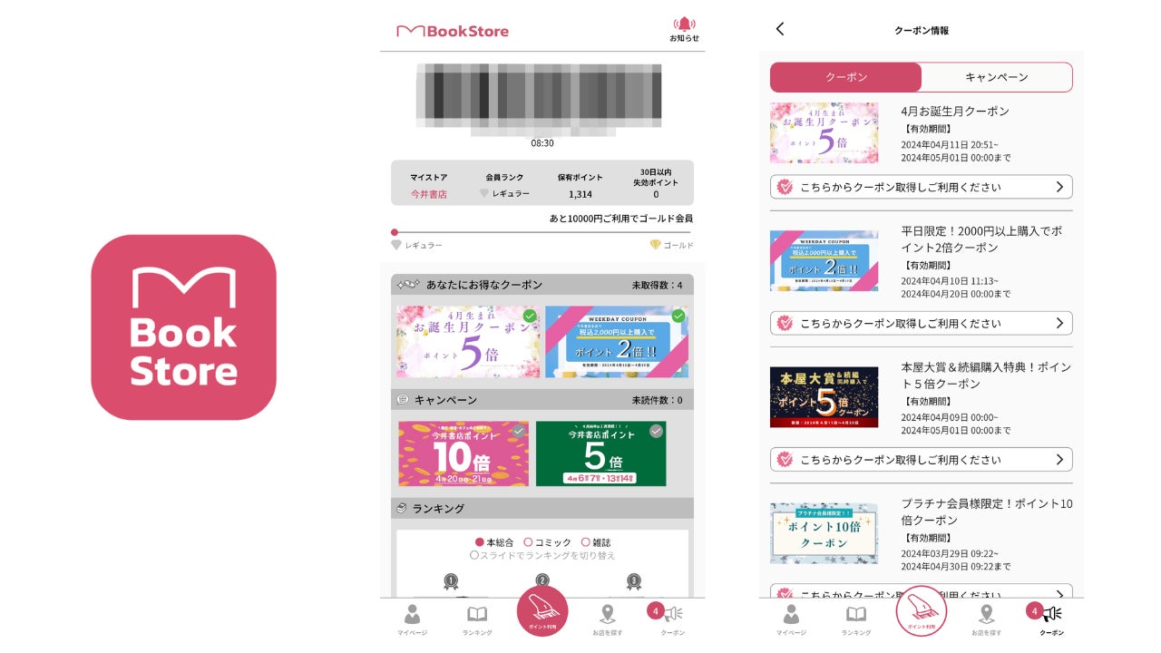 直感的に使えるアプリ画面 「BookStore」アプリは直感的に操作ができ、初めてのユーザーでもすぐにポイント管理やプロモーション情報を確認できるように設計されています。